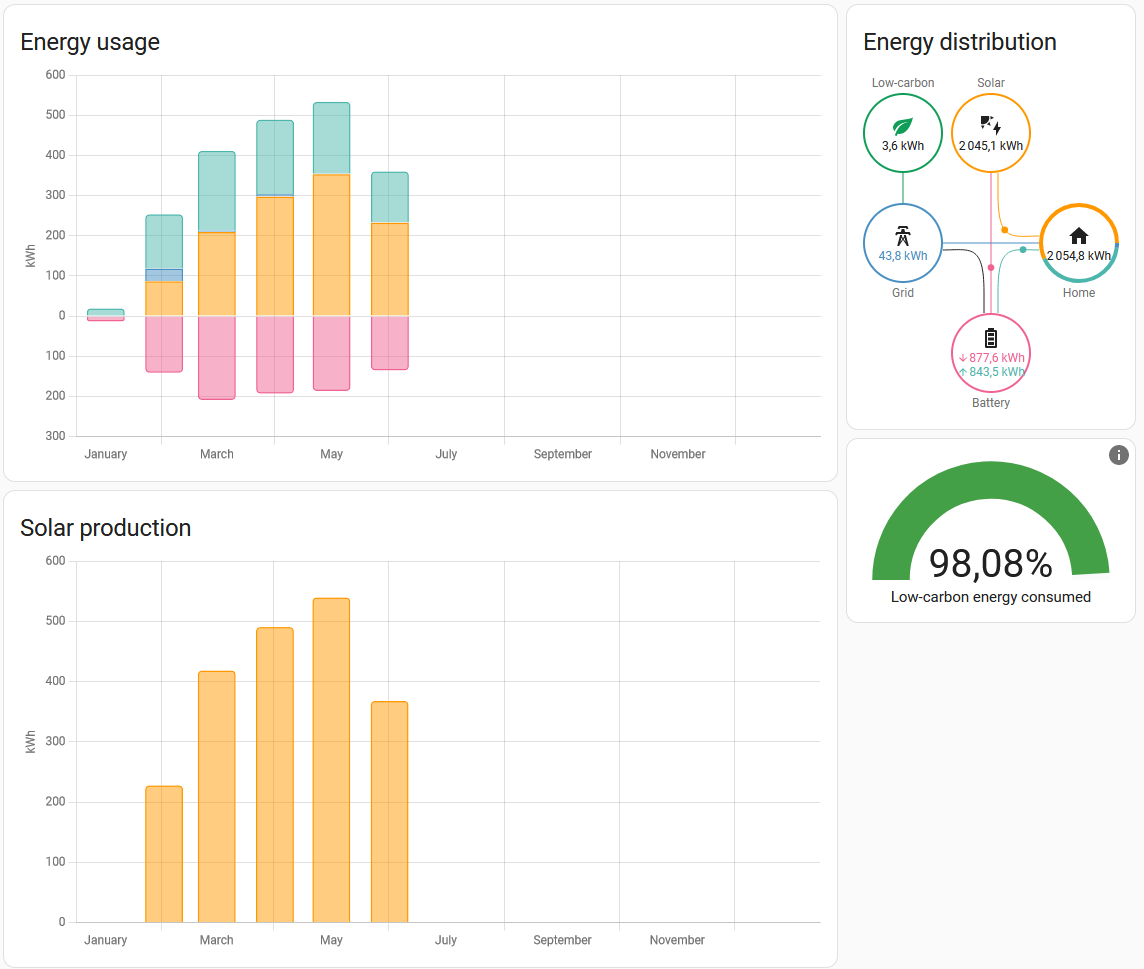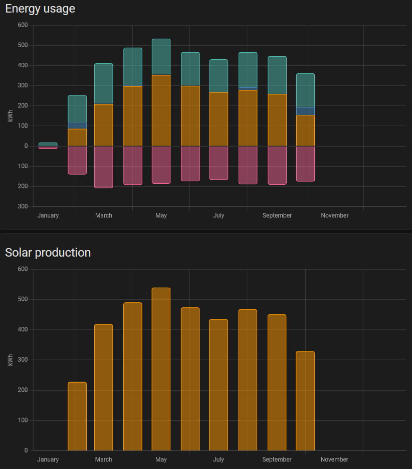 Tu je aktuálny stav od spustenia, jasné že to zima pokazí, ale zatiaľ maximálna spokojnosť. Žiadne ďalšie panely ani batérie nie sú v pláne, solaritída s rozumom, niekde okolo 4 z 10