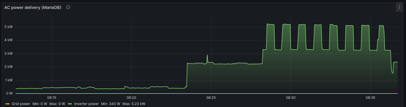 Ešte za premávky som trochu upravil rozvádzač a pridal 1P prepínač sietí a na ňom je zavesený okruh, kde je iba el. rúra a zásuvka s rýchlovarkou. Ak by som ich tam aj nechal natrvalo, tak mi komplet odpadnú problémy s preťažovaním meniča. Kanvica to sú úplne minimálne škody pri trvalom pripojení na grid, a rúra... ešte zvážim.