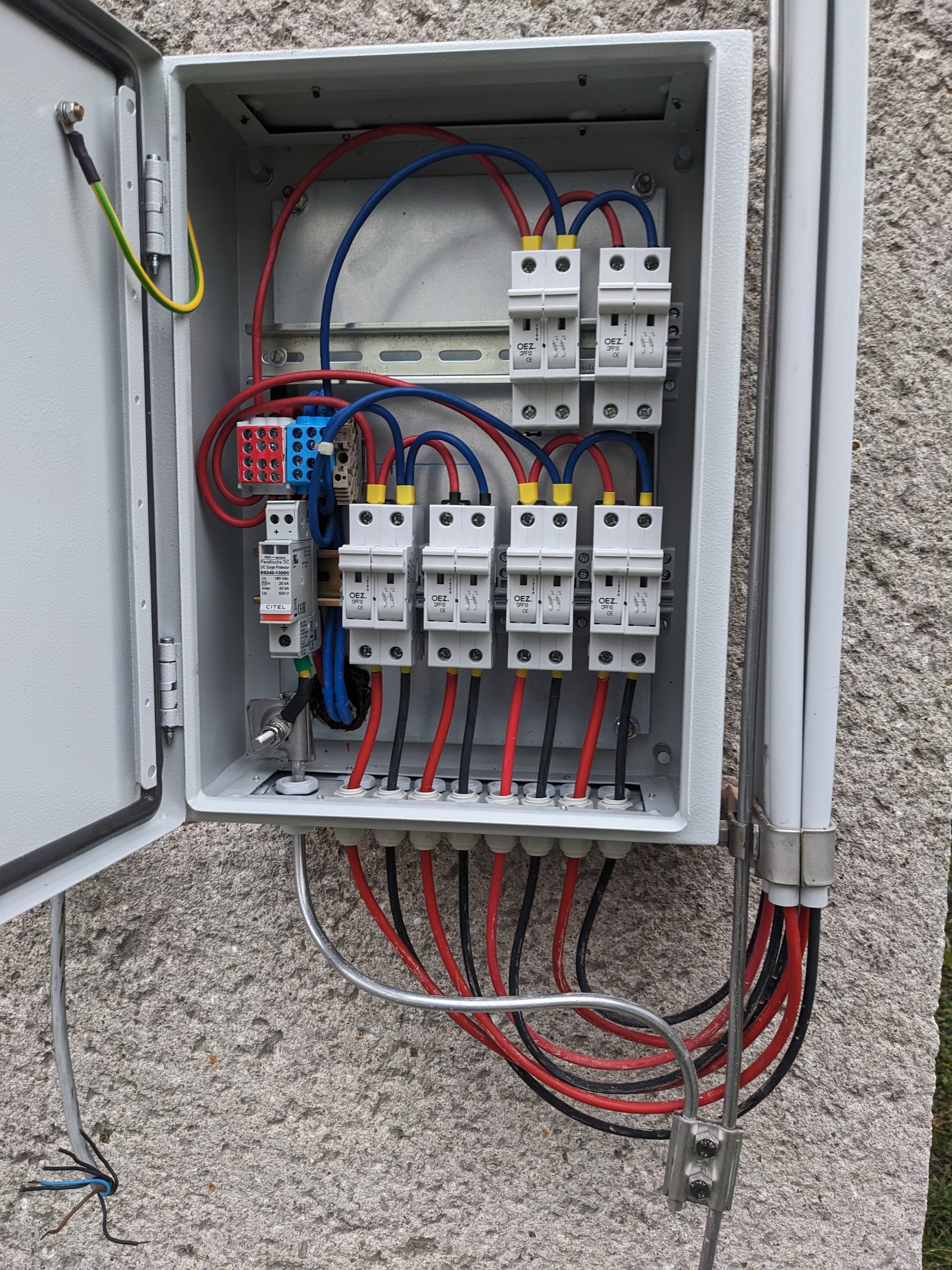 Na povale hned pod panelmi ci uz v dome alebo pristavbe mam prve poistky na kazdy string panelov a prepetovku T1+T2 a potom dolu uz idem len s jednym plusom a jednym minusom do kombiboxu ktory je pred technickou.Tu maju kazde stringy svoj odpinac a dalsiu prepetovku T2 aby to bolo mozne zhodit bez toho, aby clovek hladal kluce od technickej a podobne.