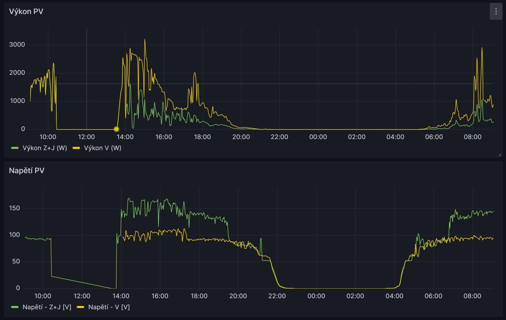 takova zajimavost. Vcera jsme zapojil druhy mppt a dal na nej moji jizni stranu, kam jsme dal nove panely. 4 do serie, 500wp = 2kwp celkem a asi 160V. Zbytek je stejny 3s4p po 330wp = 4kwp celkem a asi 110V.