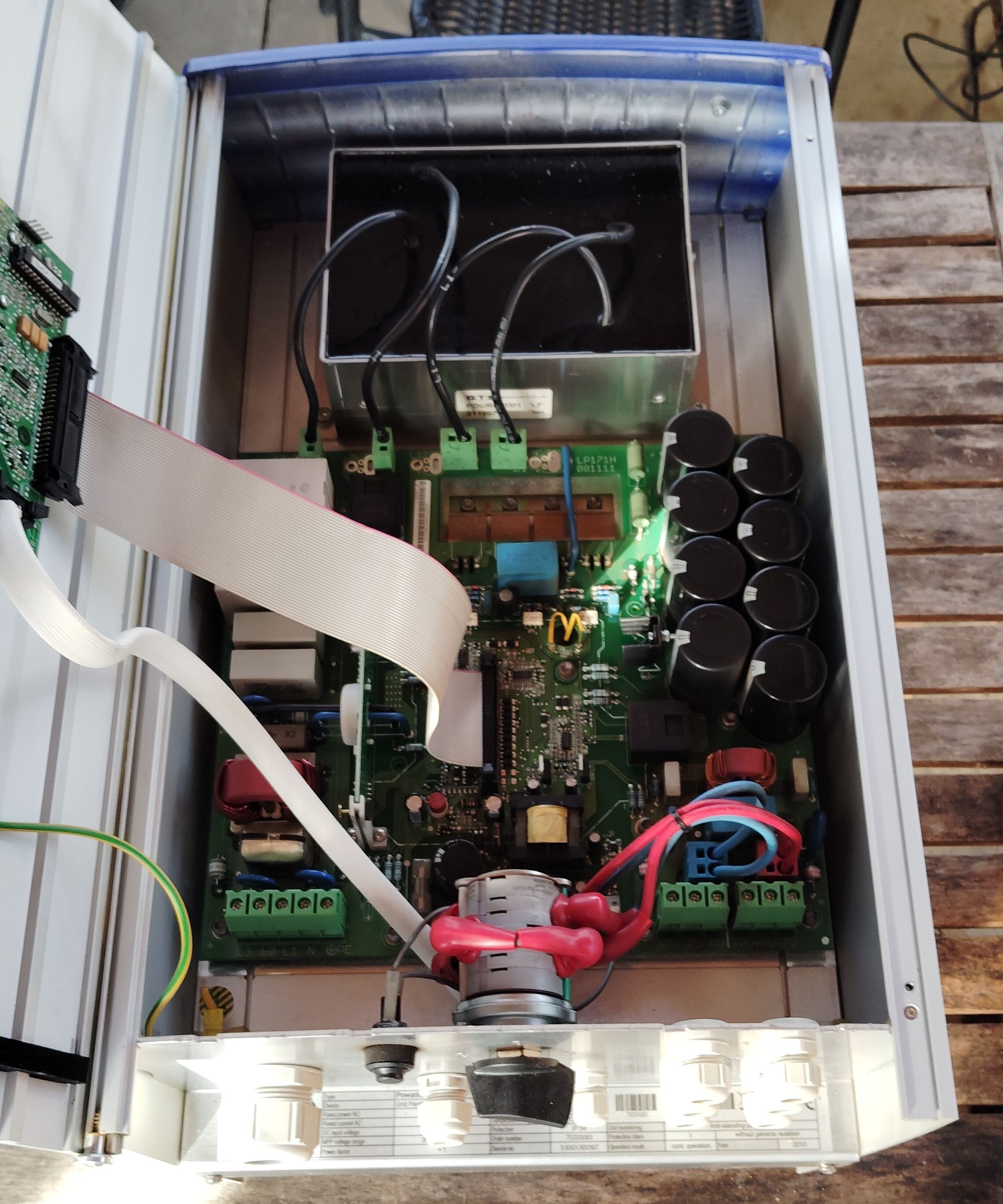 A náhodou jsem se ještě dostal k ongrid měniči Powador (modrá je dobrá), který jsem zachránil před cestou na sběrný dvůr. Takže ideální domeček pro náš nový DIY měnič. Ze zadu má mega chladič.