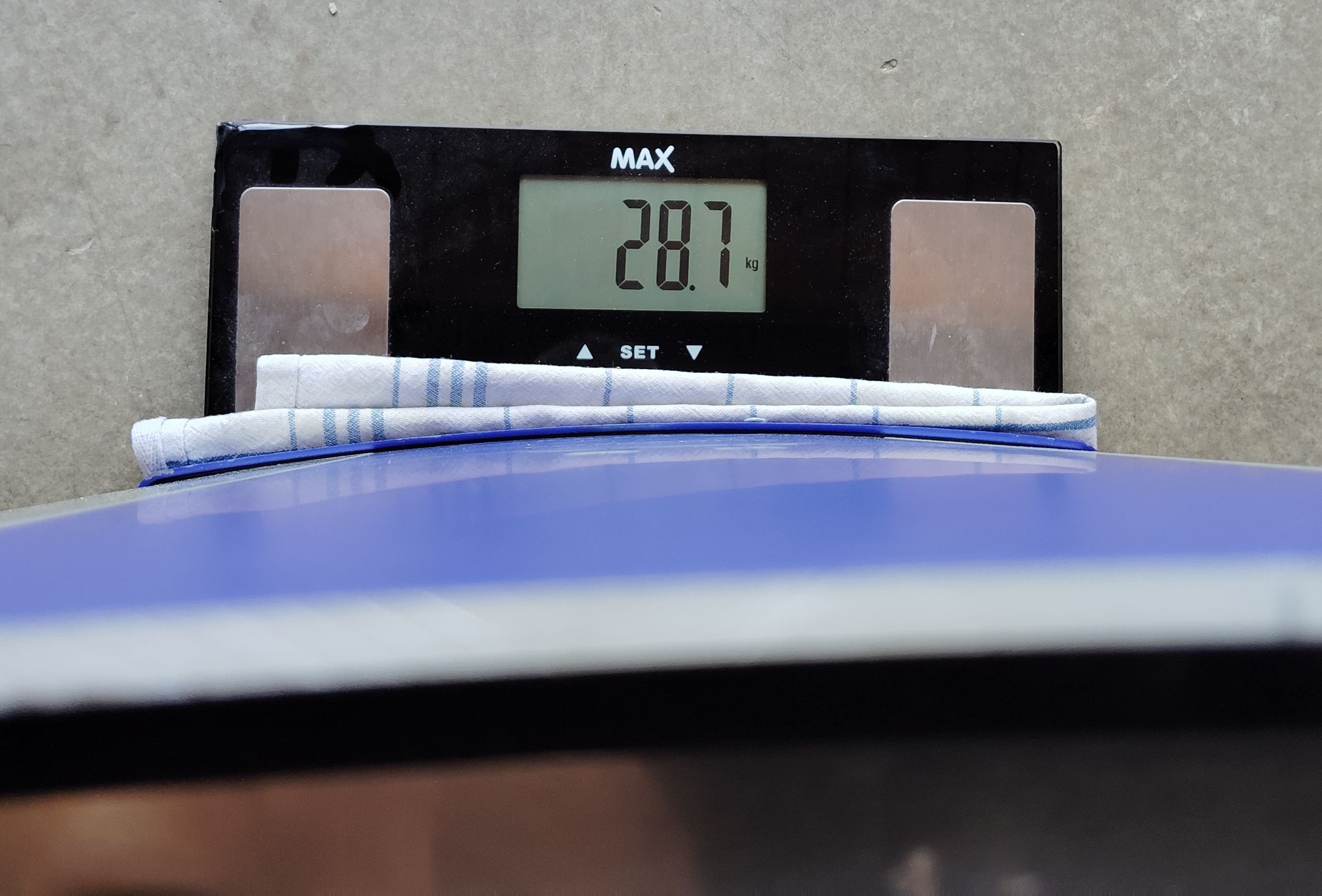 A ještě jak se to u novorozeňat uvádí, váha (prázdná bedna a měnič komplet) - myslím, že to možná bude nejtěžší 1kVA měnič na světě