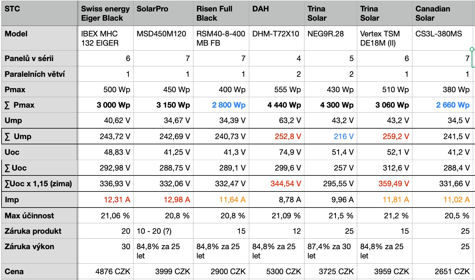 Na ten proud (Imp) jsem se prave ptal v otazce vyse, ale nikdo neodpovedel. Diky za odpoved, takze by Imp mel byt <10A. A co ten DAH (8,78A) a Trina (9,96A) z moji tabulky? U DAH a Triny uz se mi nepodarilo vmestnat soucet napeti (Ump) do rozmezi 230V-250VDiablo1st píše:Ak dobre čítam datasheet k Sitonu tak max. Voc je 400V a max. trvalý prúd 8-9A. Čiže asi je zbytočné premýšlať o paneloch, ktoré dávajú 10A a viac. Týmto odpadá aj paralelné zapojenie, všetky panely musia ísť do série.