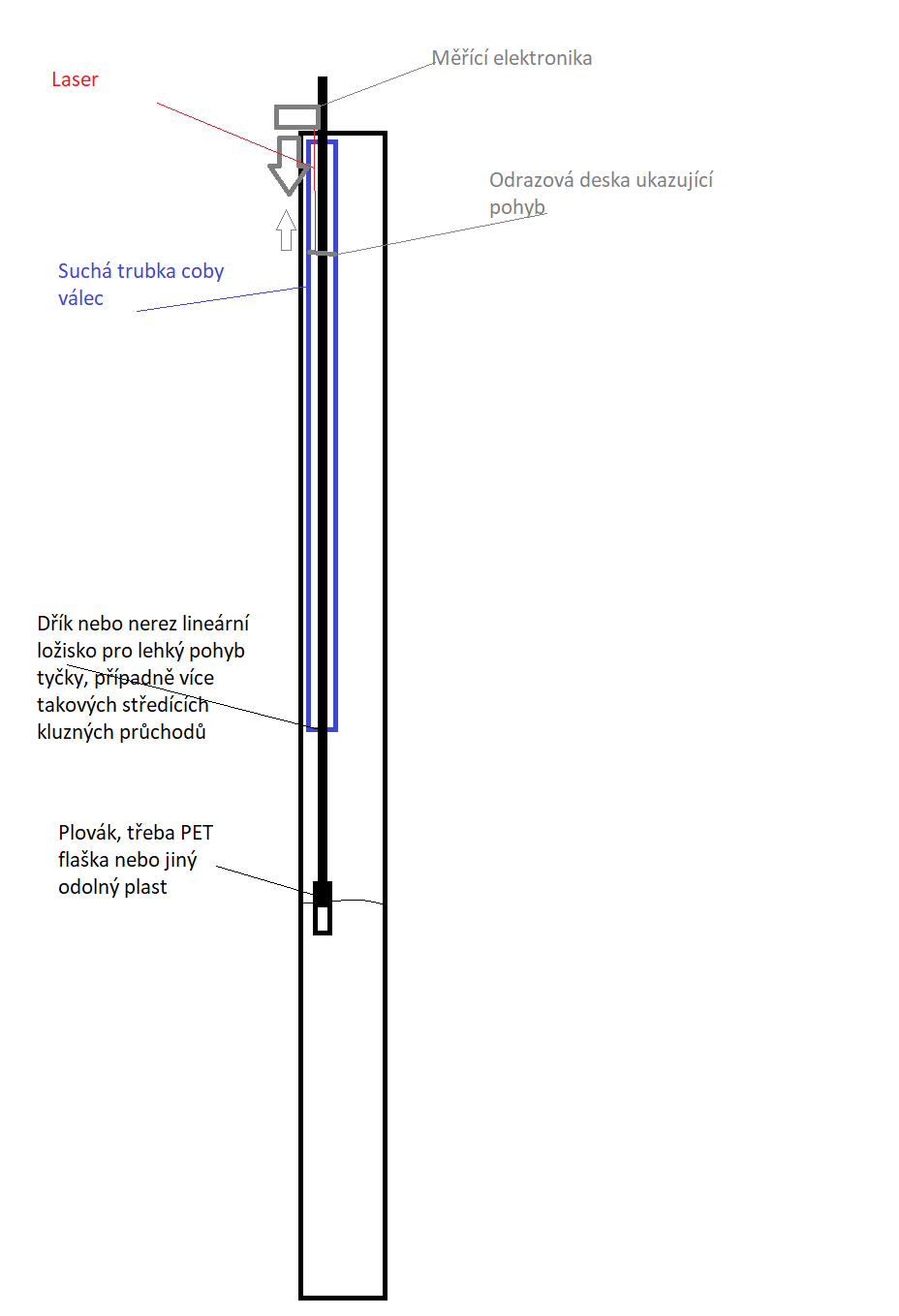 Tak teď mne napadlo udělat kvalitní dřík na deklu suché trubky v které by byla tyčka a mít tyčku v uzavřeném prostoru hodně nad očekávanou hladinou a vzhledově např. plastová trubka okolo 40-150mm průměr a na jedné straně tyčky plovák na hladině a na druhé straně odraz pro ultrazvukový nebo laserový snímač který by ležel naproti v nějaké úrovni i 15 metrů od odrazový pohyblivý plochy.