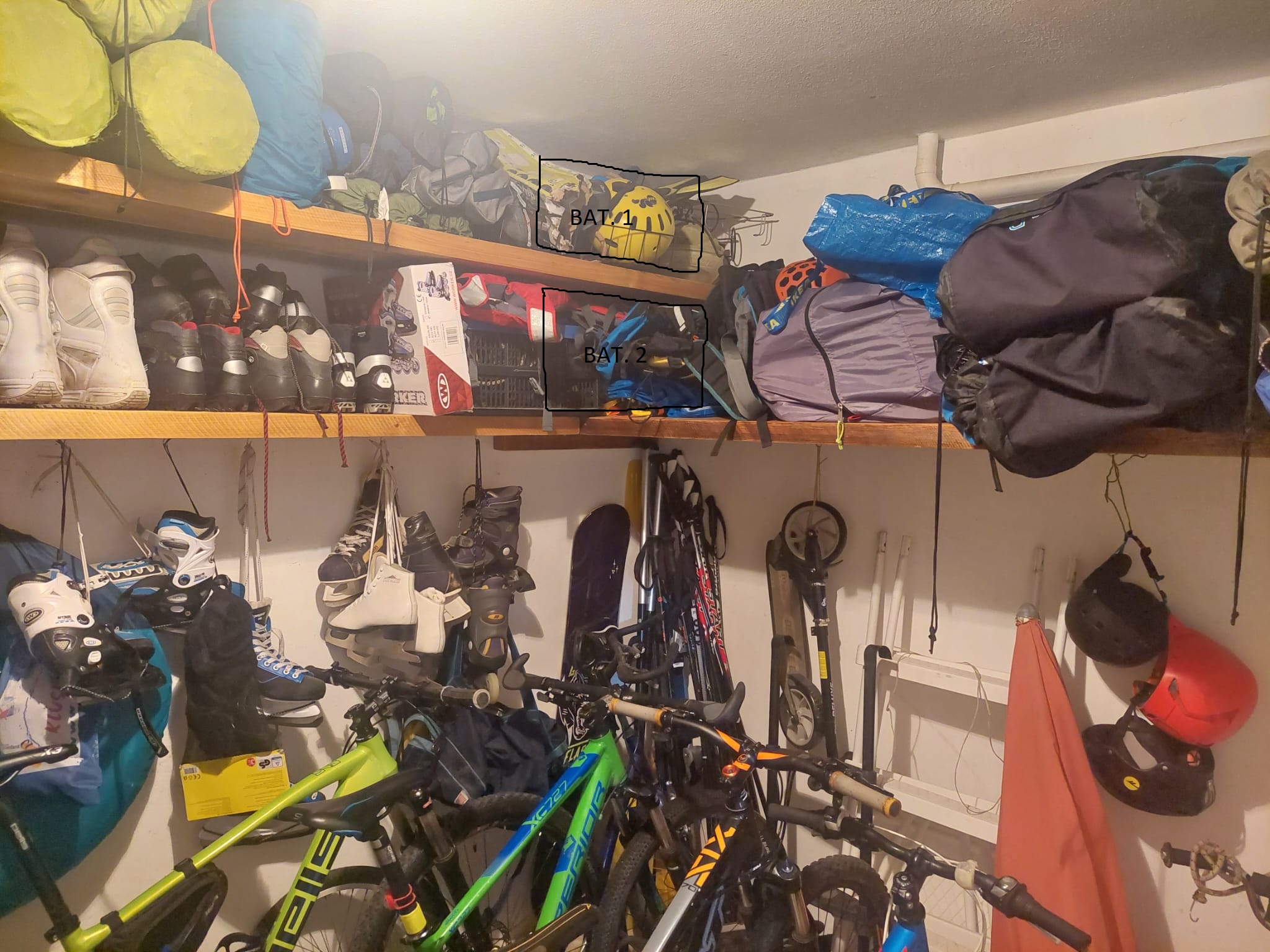 Díky za reakce. Easun jsem nechtěl umístit do uzavřené místnosti ve sklepě z důvodu možného přehřívání - tam kde to připadá v úvahu není žádné odvětrání. Už teď máme sklep dost teplej, v místnosti s mrazákem neklesá teplota pod 15C ani v zimě. Nejlepší pro mě Easun asi na podestu u schodů do sklepa a baterky pod strop na existující police, kde zatím máme sportovní věci - viz obrázek. Tahkle by to bylo od sebe max 1m. Jen nevím jestli je dobrý dát Easun tam, kde se kolem chodí a kolik místa kolem baterek nesmí být hořlavé věci.