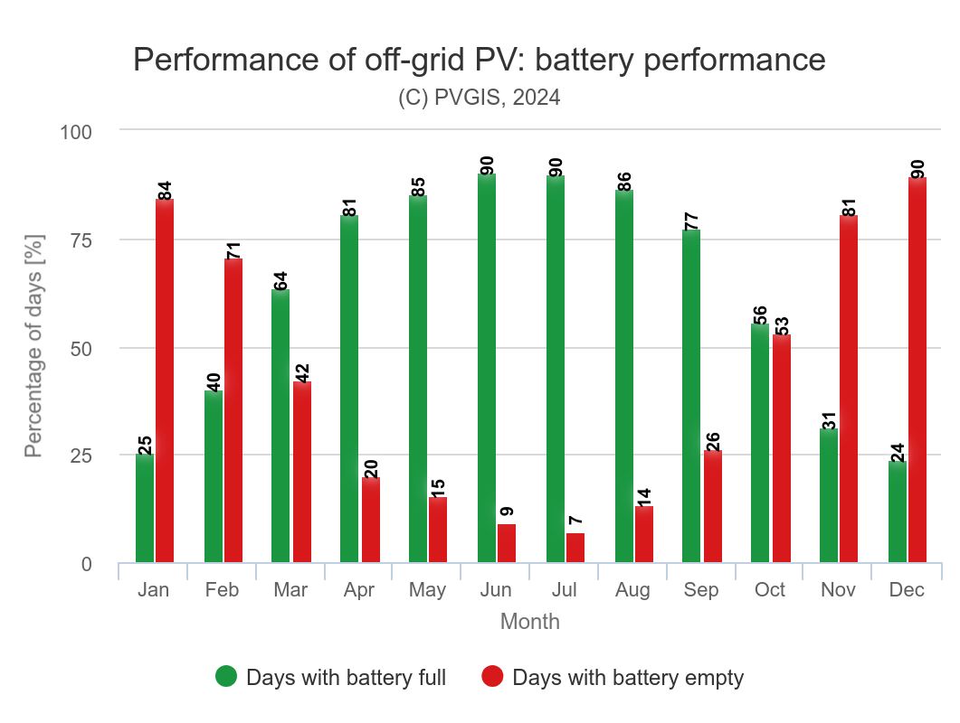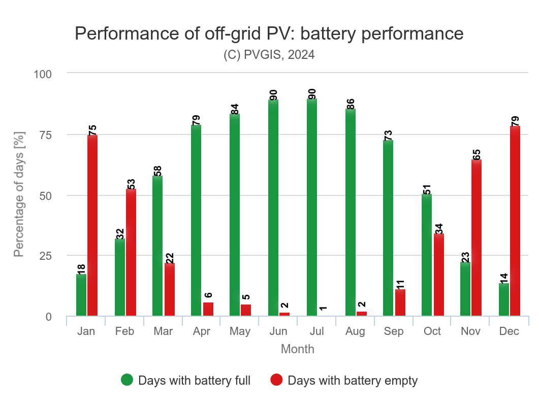 tj celkem 2+0.6+0.01+0.05+0.25=2.91kWh. Neřeším nářadí příkony, měniče. pokud se chata fakt používá jenom červen červenec srpen, tak je potřeba zjistit, kolik je potřeba baterek a panelů, zde: https://re.jrc.ec.europa.eu/pvg_tools/en/ vyberu offgrid, vyberu co nejpřesněj (doopravdy přímo střechu chaty, počítá i lokální stíny od kopců) a zkusím zadat spotřebu 2.9kWh denně. Nazdařbůh jsem klikl někde do zeleně kolem Bohumína. a výsledky: