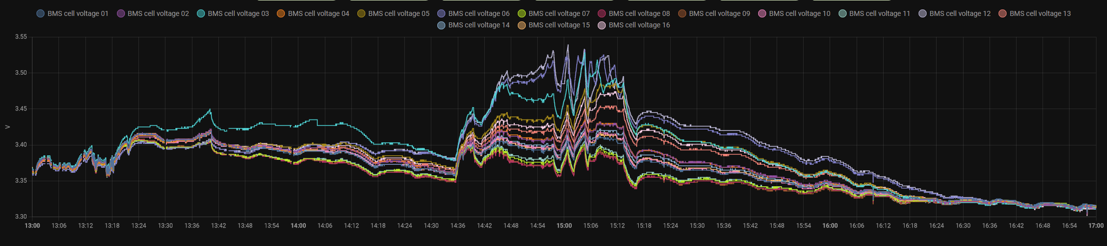 Hele, ten článek 06 a 12 (jestli jsem trefil barvy) mají divný úlet v čase 14:48 - 14:57. Všechny články mají mírný pokles napětí, kdežto tyhle lezou nahoru (napětí nad 3,5V, BMS evidentně to už nedává). Máš tam nějaké paliče?TomHC píše: pon úno 12, 2024 7:50 pmMňa (a balancer) čaká trochu viac práceAsi by bolo najlepšie baterku odpojiť a nechať ju pomaly vybalancovať.