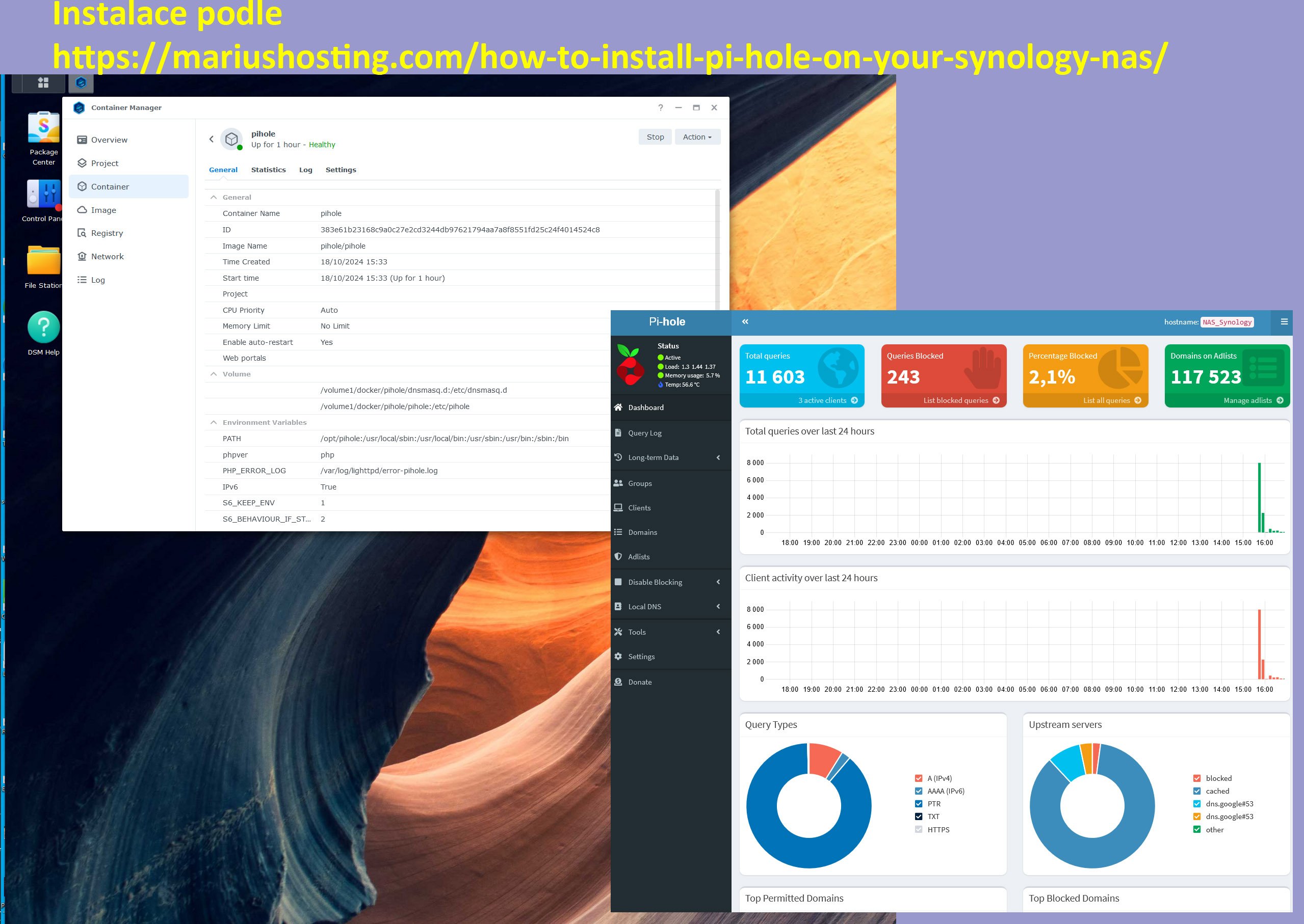 Konečně jsem se dostal k tomu proč Pi-hole nefunguje v NAS Synology a hlásí obsazený port 53 i když obsazený asi nebyl, protože v Synology nebyl nainstalován balíček DNS ani DHCP.