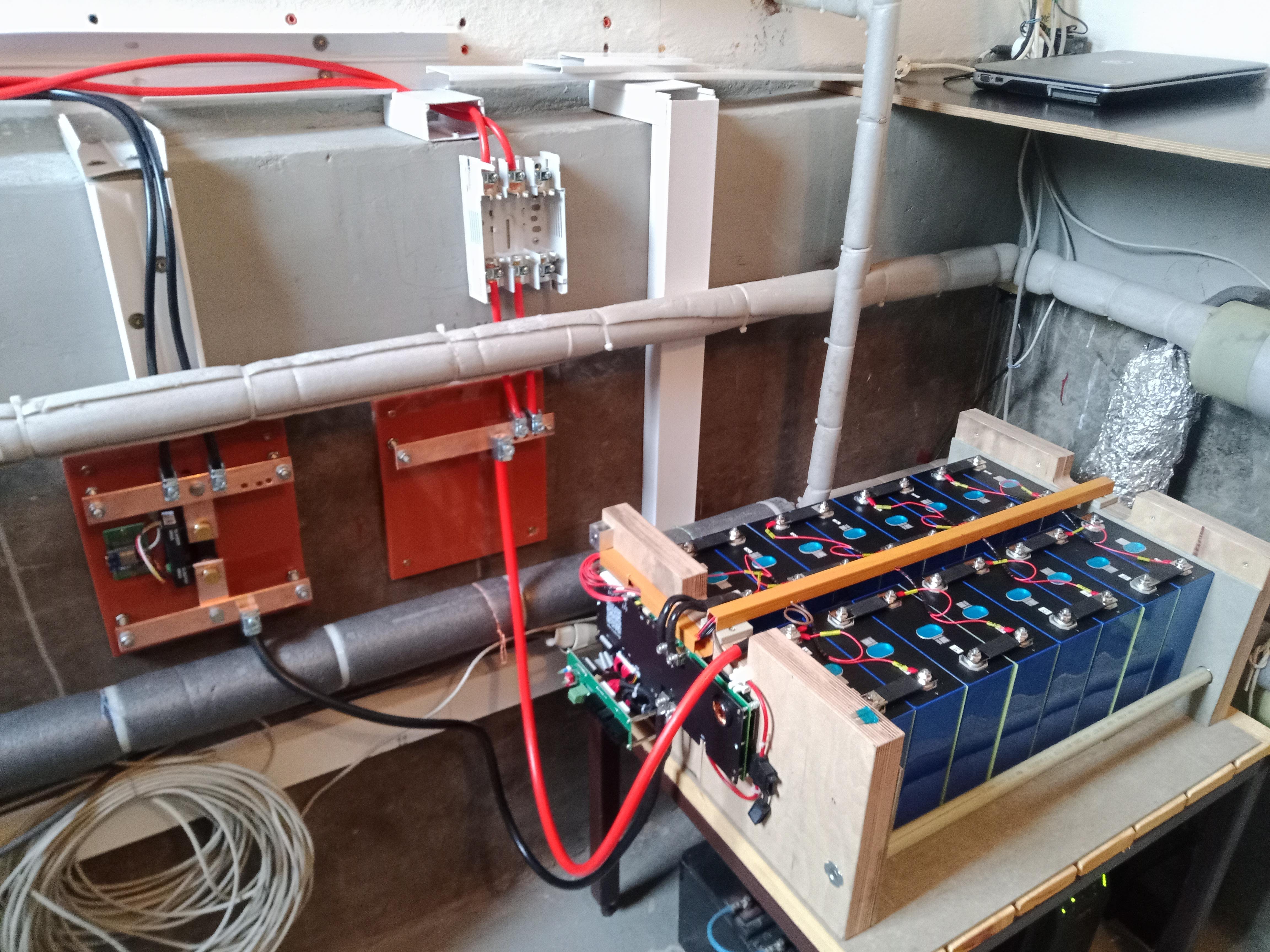 7.8kWp (12x650Wp jih 35°: 2p3s EpeverTracer6420AN, 3p2s AxpertKing), AxpertKing 5kW/150V. LiFePo 34kWh: 18x280Ah (2022)+18x315Ah (2026). 2xJBDBMS-UART->ESP32->grafana+vytěžování 60V/4.8kW do NADO750. 5x280Wp (2013)-> přímotop.