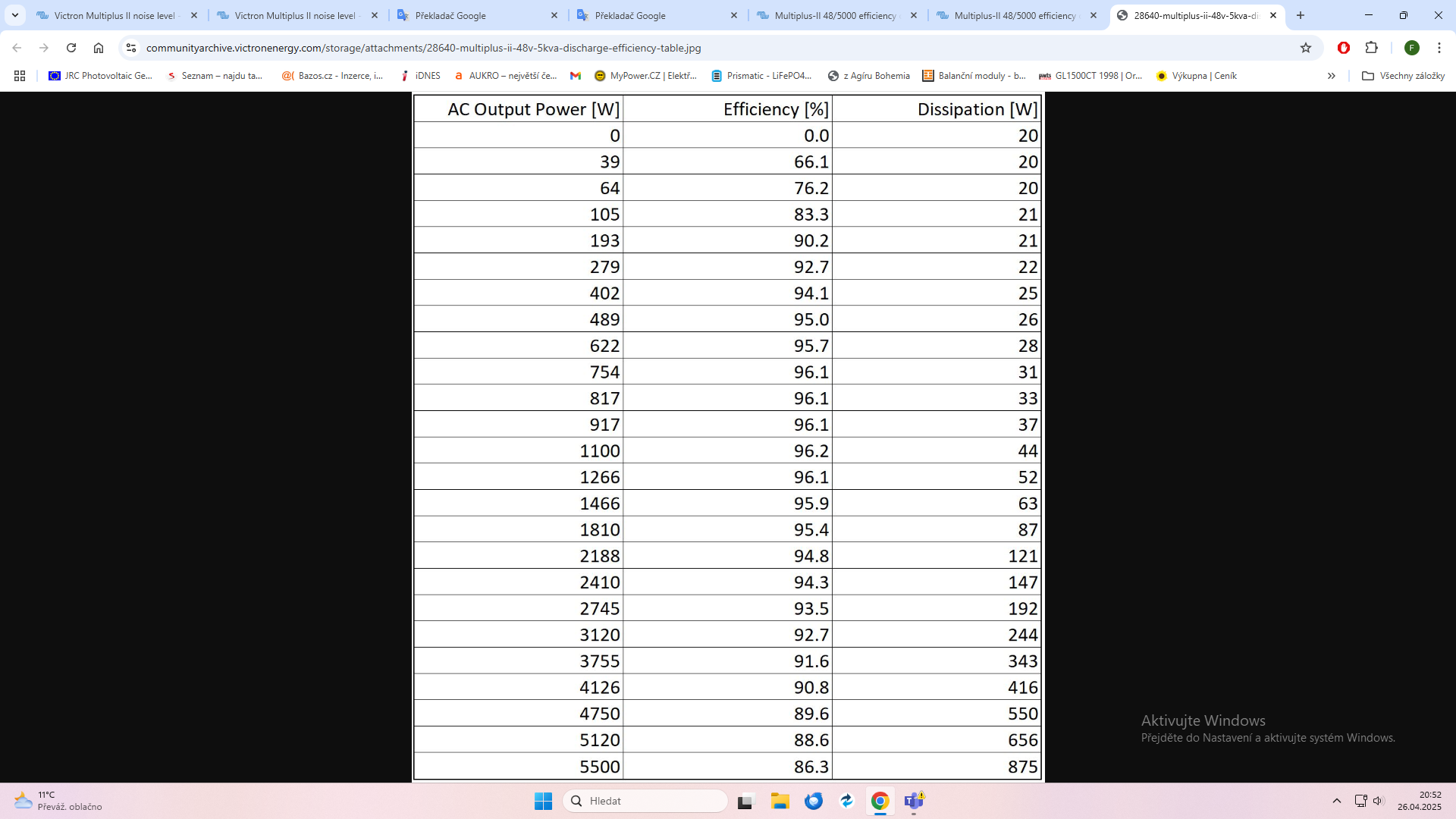Tady je ta účinnost Multiplusu přesněji, toho tepla je tam při zátěži hodně: