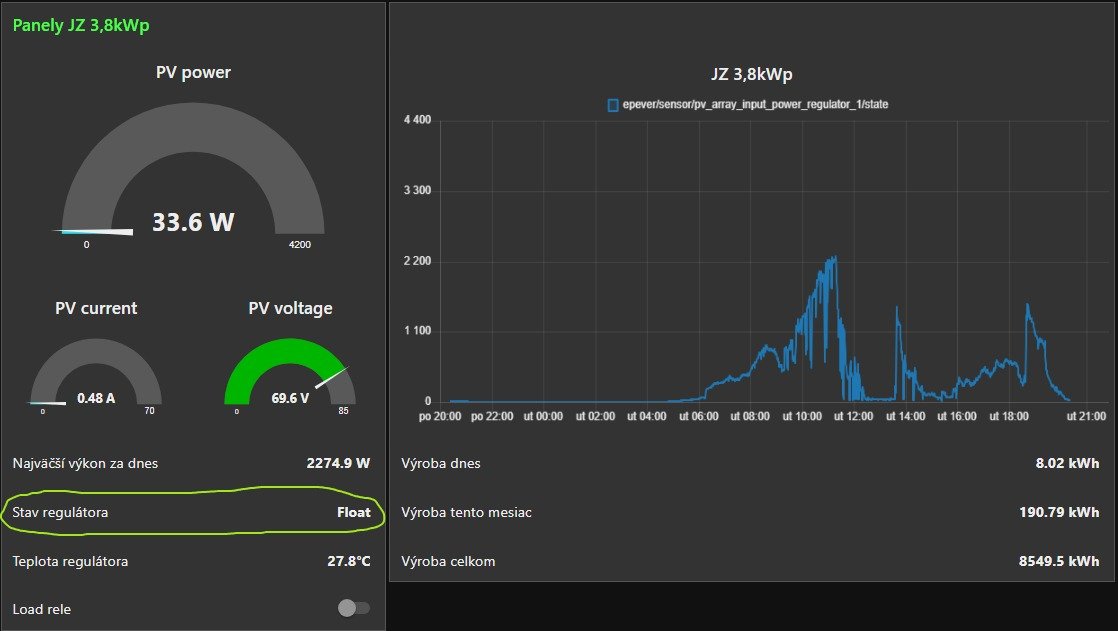 Konecne vidim oba regulatory naraz bez toho aby som sa nejako musel medzi nimi prepinat napriklad cez bluetoot alebo podobne, a hlavne to uz mam pekne v nodered kde mozem citam uz vyroby a robit si grafy a nieco to pomoze aj automatizacii.Jedine co mi zatial nejde je to ze nedokazem ovladat z nodered Load rele na regulatoroch. Idu spinat zatial iba z weboveho rozhrania esp.Bude to chciet upravit asi ten yaml subor asi...