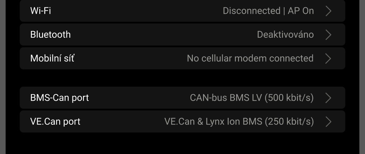 Terminator je jen v MPPT. Z Cerba jde jeden Ve.Can do BMS tam ma jeden Can port a druhy do MPPT tam je pak terminator. Jak zmenim Ve.Can na BMS LV 500 zmizi MPPT a objevi se BMS