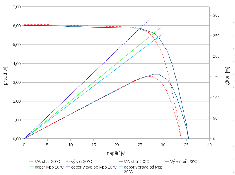 ....stále jsem se k tomu nedostal. Chtěl jsem to přesně spočítat, ale už bych rád z práce domů, takže jenom odhadem. Pokud se tedy budeme pohybovat po VA charakteristice vlevo od MPP (zatěžovací odpor je menší než odpor při MPP), tak z panelu "vyždímáme" mírně větší výkon-ovšem nikdy více než v MPP. To mírně jsem chtěl vyčíslit a porovnat kolik se ztratí od bodu maximálního výkonu. No zkrátka si musíte udělat obrázek sami. 1 vodorovný dílek v grafu je 50W...jhladik píše:Tak již rozumím co jsi Matěji chtěl říci.....ještě obrázek doplním, snad se k tomu večer dostanu. J.