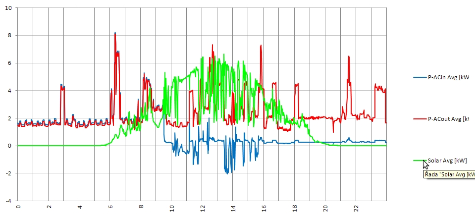 No tak ten graf mi nic neřekne o výrobě FVE, ACin v kW a AC out v kW. Já moc takovým vlnkám nerozumím, pěkně se nato dívá, ale opravdu mi to nic neřekne. Dále 3kW motor s kotvou nakrátko podřebuje měniče 3, nebo 230V frekvenční měnič, který svou logikou dokáže takové VA výkyvy eliminovat. To mám zkušenost zase z léta, když jsem testoval na Victronech nový stroj, který z 230V přes měnič vyráběl bez problémů a jel a byl hodně pod udávanou štítkovou hodnotou odběru právě kvůli fr. měniči.