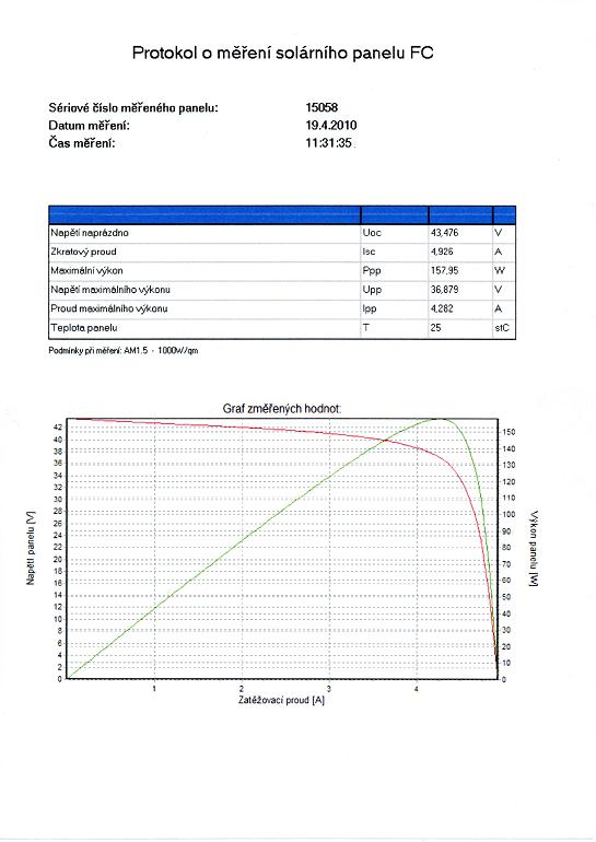 1. panel je v pořádku , při zátěži 3,7Ohmu (39,7Vmp : 7,97Amp = 3,7Ohmu) naměřím při jasné obloze a kolmé pozici panelu k slunci 35,4V a 7,25A což by odpovídalo štítku .