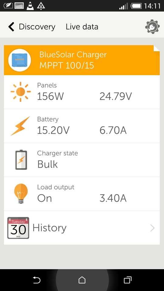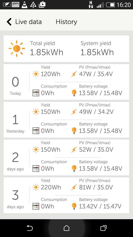Ano z telefonu. Historiu (posledných 30 dní) exportuje vo formate CSV. Tieto údaje. Days ago Yield(Wh) Consumption(Wh) Max. PV power(W) Max. PV voltage(V) Min. battery voltage(V) Max. battery voltage(V) Time in bulk(m) Time in absorption(m) Time in float(m).