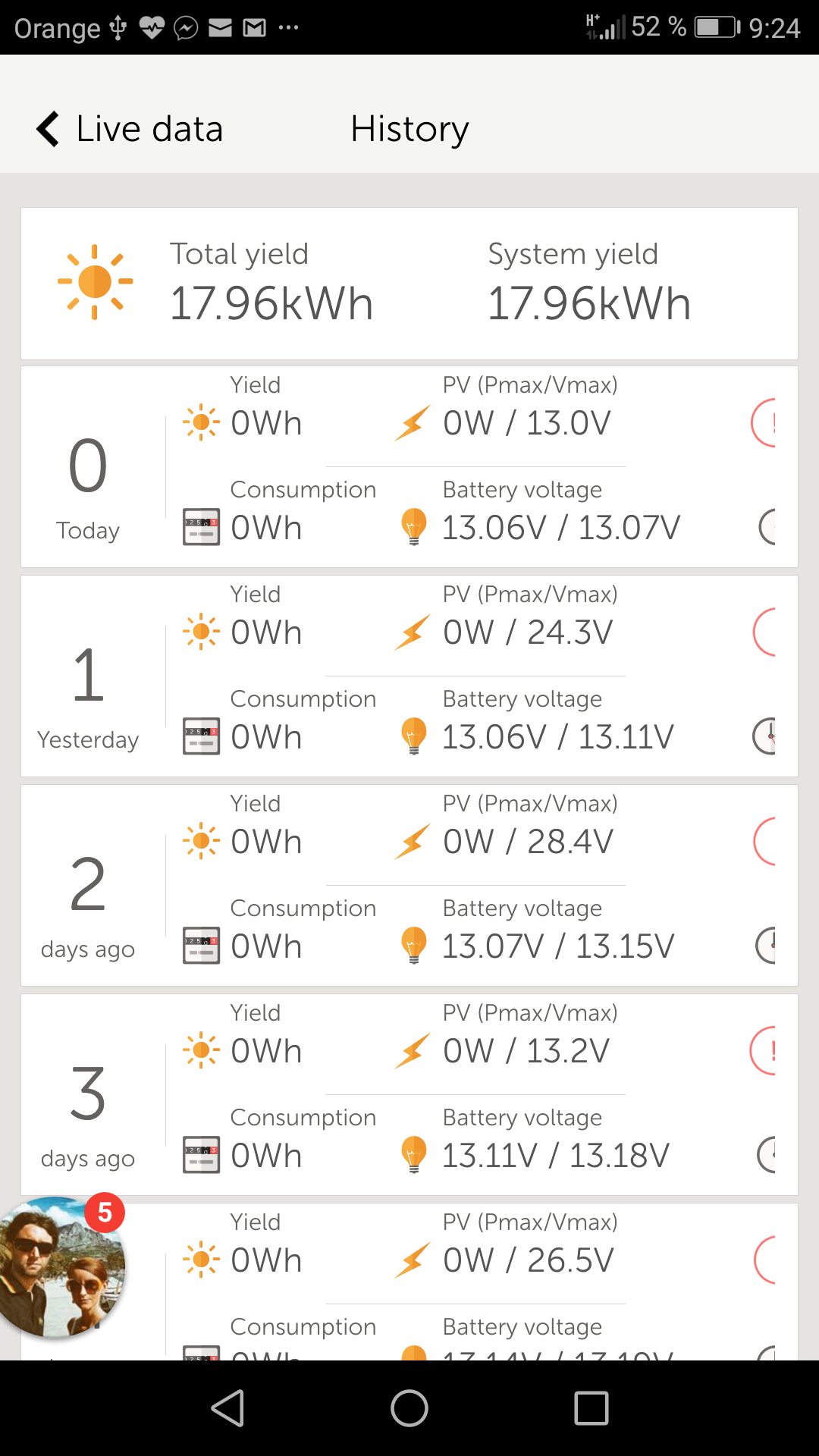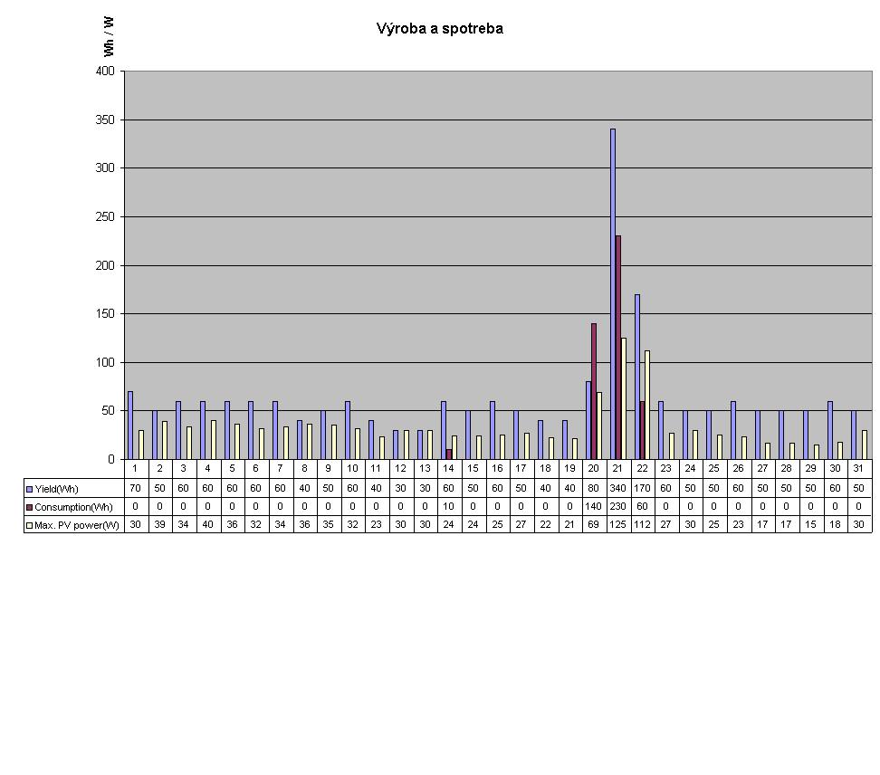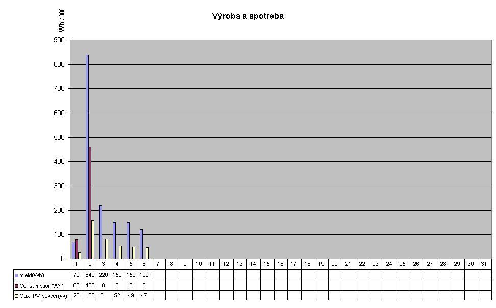 Ale v spotrebe je nabijanie NB, svetlo, a nonstop chladnička s teplotou - 2,5 st. C počas víkendu. Všetko len DC a DC menič. Jedine co sa mi nepozdáva je max PV. V prvý deň to bolo 223 W. Ale potom maximum len 158 W. Tak neviem kde je chybička. Den 4 v historii je sobota - najvytaznejsi den.