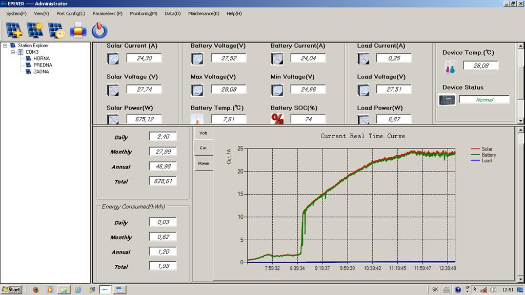 V jiném vláknu https://forum.mypower.cz/viewtopic.php?t ... 602#p70602 probíhá diskuse, která by se hodila více sem. Jinak bych chtěl demonstrovat jednu nevýhodu mppt regulátorů. Musí hledat to správné napětí, při kterém dává string max. výkon. A tady záleží na výrobci, jak úspěšně toto implementoval. Při jasné obloze se asi nic moc dít nebude, ale pokud budou přecházet mraky, nebo nějaký stín přes panely, je potřeba znovu tento bod nalézt. Obrázek je z předvčerejška, kdy jsem náhodou viděl, že napětí mppt je podezřele nízké a kdoví, jak dlouho by takové zůstalo, kdybych na chvíli neodpojil a znovu nepřipojil panely. Špatné napětí znamená menší výkon. Samozřejmě EPSolar není špička, ale není to ani žádný čínský noname mppt regulátor.