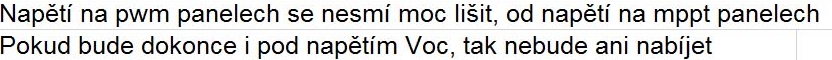 Jsou tam i varianty "micro hydro" "wind" co asi nikdy nevyužiju, a je tam i možnost "%VOC", což by bylo to, co požaduje RVA, včetně změny napětí s teplotou. Nastavení konstatního napětí panelů - to je vlastně ta moje vymyšlenost pro malý amorfy, kterou jsem si nazval "dopřednej regulátor" . Další zatím netestovaný varianty nastavení jsou "real P&O" a možná ještě něco, nějak se v tom v posledním roce nevrtám, co funguje, na to se nesahá (první servisní zásada).