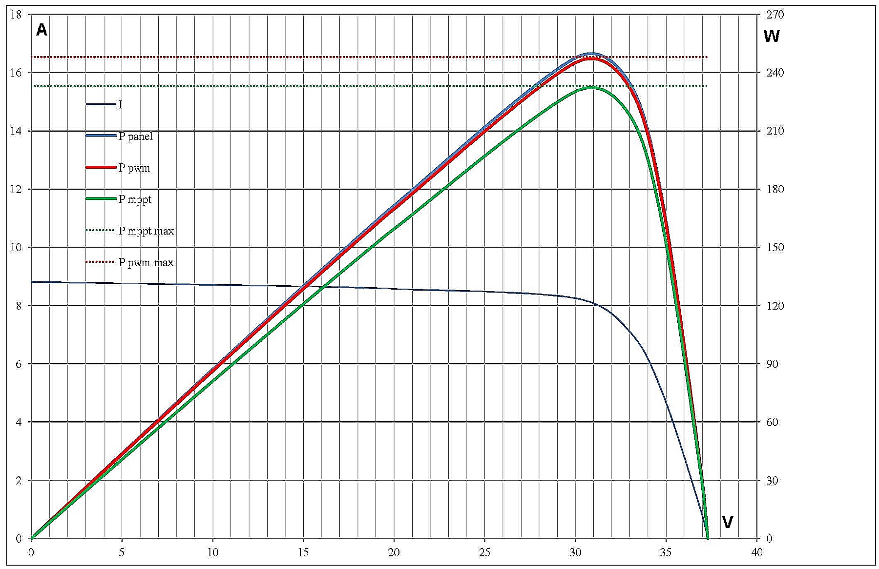 Pretože výkon mppt nemôže v žiadnom režime prekročiť zelenú bodkovanú krivku, je v rozsahu 28,3 V až 32,8 V pwm vždy vo výhode a dáva väčší výkon.