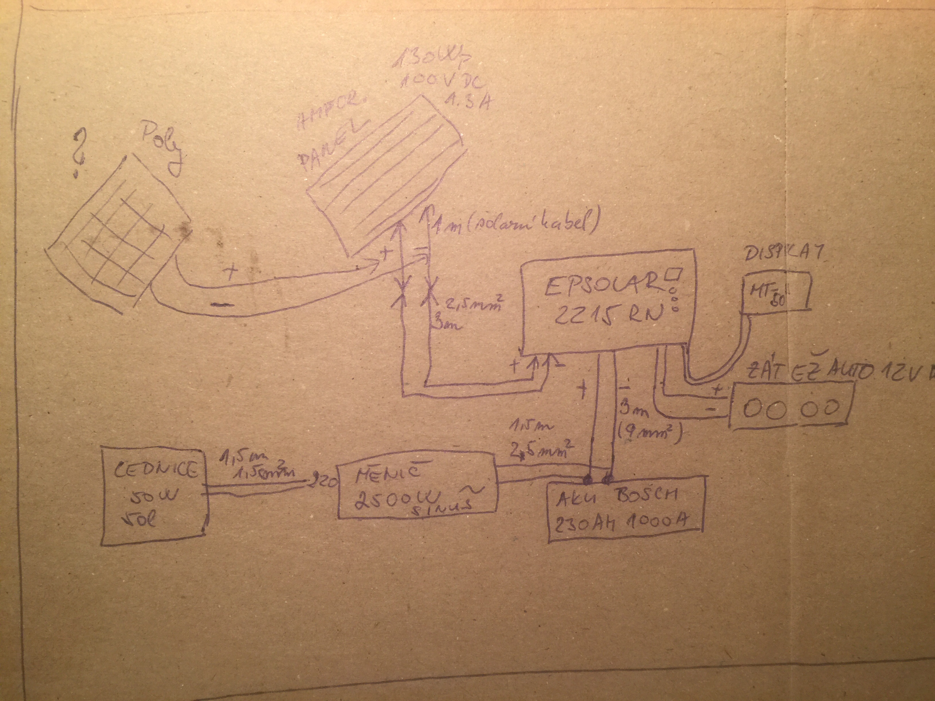 Pokud najdu fotografie tak dodam jinak se pokusim nacrtnout nejakou skicu jak to mame zapojeny. Kdybych to zrizovl ja odpocatku hledel bych na ampery aby byli vysoke do maxima regulatoru. Nyni z panelu tece pohych 1.3 co dava vyrobce k slunci je kolmo. Vzpominam si ze kdyz jsme nabijeli doma jeste kdyz baterka byla mobilni tsk na chatce vpohode utahla vikendovy zahul sekackou cerpadlo a ledky a radio na 12v ale az se nenabijela pres autonabijecku tu velkou bosch tak nebyl. Uplne dobita jsko by jen ozivena.