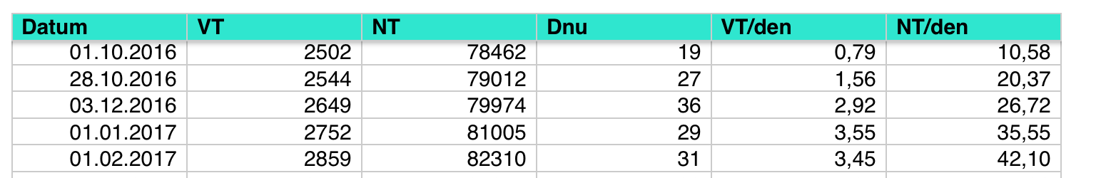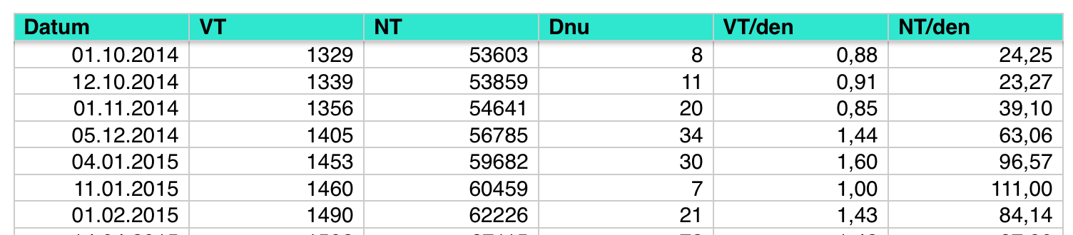 Svagr ma NIBE 6kW zeme (hadice v zahrade) a podlahovky. Novostavba (myslim, ze uz ~4 rokem, mozna uz i 5tym) - domy Rymarov, 2 patrovy domek, 2dospeli + 2psi, rybicky, papousci. Modelar amater - rekl bych, ze nabiji tak 2x tydne battery-pack do quad/hexa/cosi koptery. 3D tiskarna, TV - jedou denne. Kramu na elektriku pocinaje samochodnym vysavacem, centralnim vysavacem, indukcni plotynky, nekolika routerery (ma na strese AP pro 1/2 vesnice), switche, NAS, kamery a mraky dalsich elektrickych kramu. Bez FVE. Rocni spotreba ~6MW. TC mu spina 1-2x /den! max. Vytapi TUV 180L tusim aku do 300L (ja nevim presne - je vecer a nechci jej rusit). Dum ma patrne dobre zateplen.