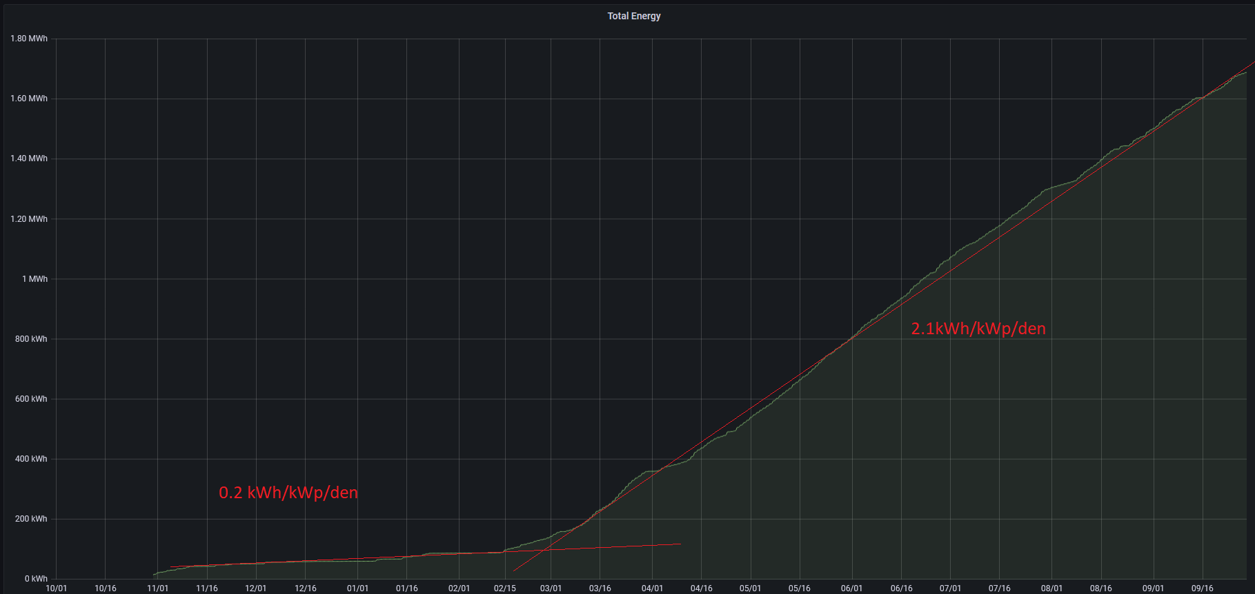 Pro svoje místo v hlubokém zamlženém údoli jsem zimní účinnost stanovil takhle z grafu výroby, v mém případě je to i graf spotřeby. Zima sedí, v létě spotřebuji tak 60% ....