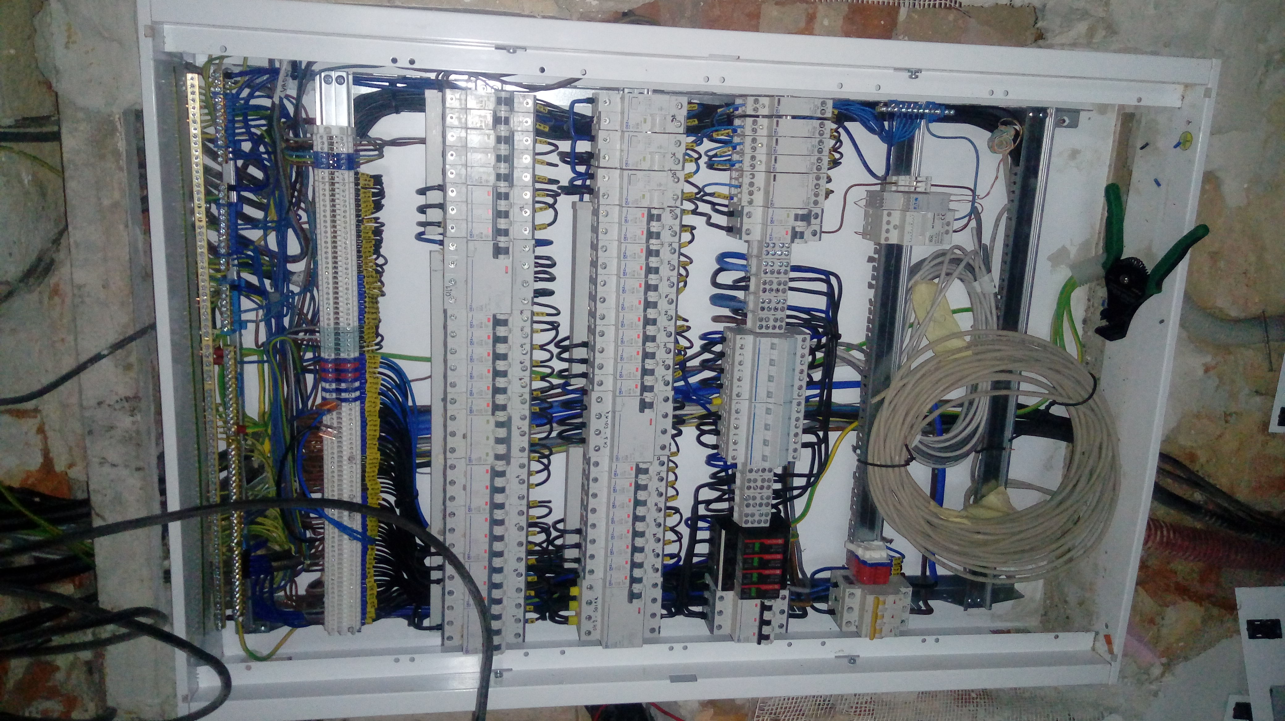 velký rozvaděč je rozdělen na 2 hlavní skupiny první je 3F spotřebiče resp jističe, + chránič a něco chráněného