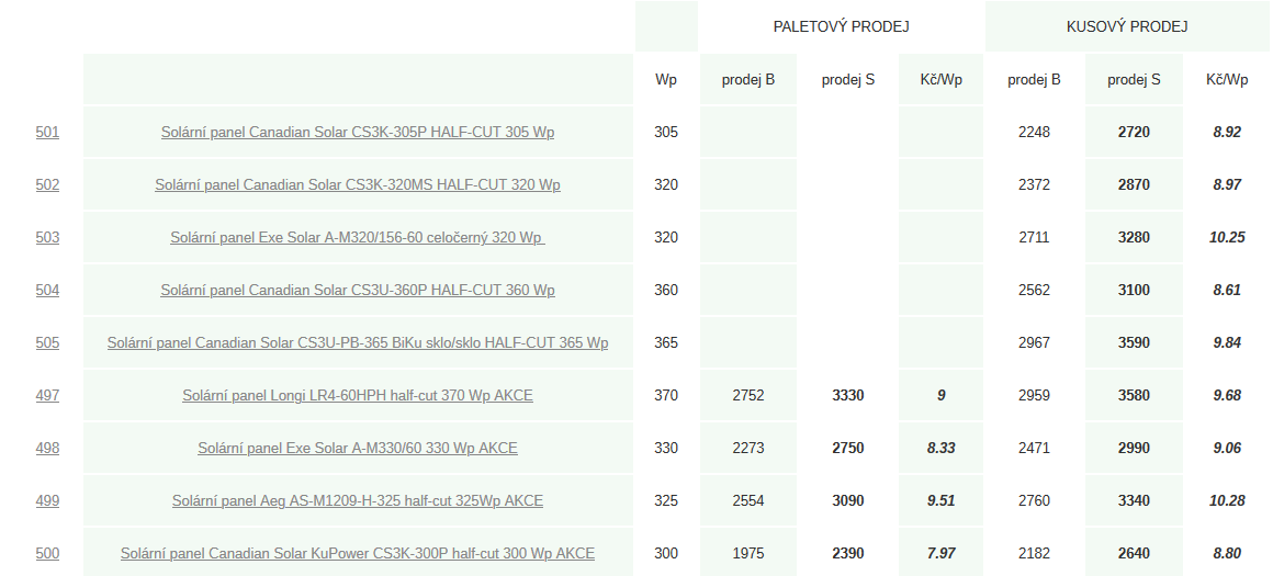 Zdravím přátelé po nějaké době, dnes z ničeho nic dodavatel slevnil veškeré mé skladové zásoby, u některých panelů došlo ke slevnění až 500 Kč, cenově nejlépe vychází opět Canadian 300 Wp kde se při koupi celé palety dostanete na 8,- Kč za Wp vč. DPH což si myslím je u takto značkového panelů výborná zpráva. Nevím jak dlouho ceny vydrží zatím platí do začáku září nebo do vyprodání zásob.