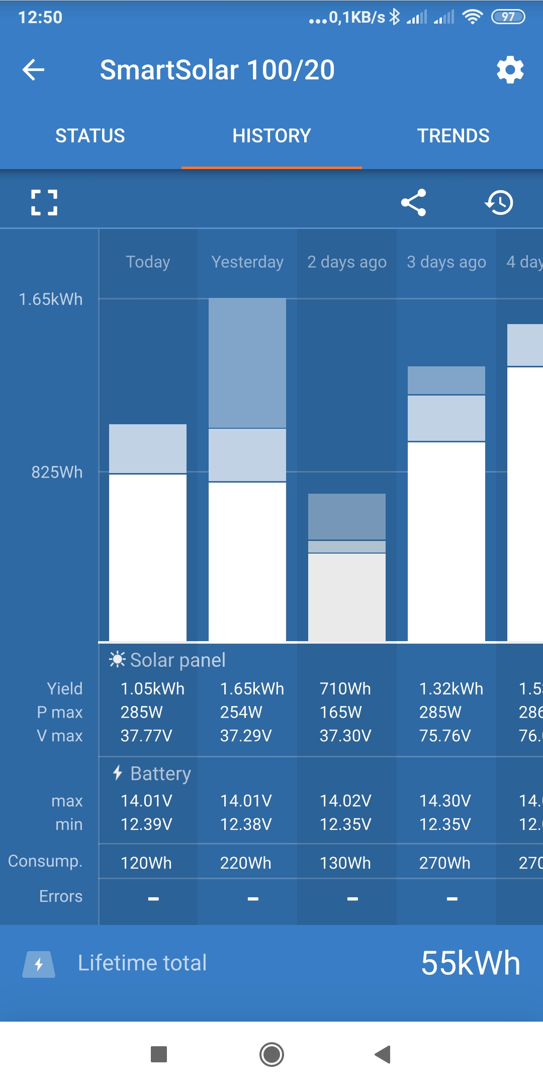 5,4 kWp JJZ 4deg,1,8kWp JV 24deg, do 13.8.2022 bylo 3,6 kWp, MPII 5k, Victron MPPT 250/85-TR, aku 9,45 kWh Lion 15S, BMS 200A, Smart Shunt 500A.