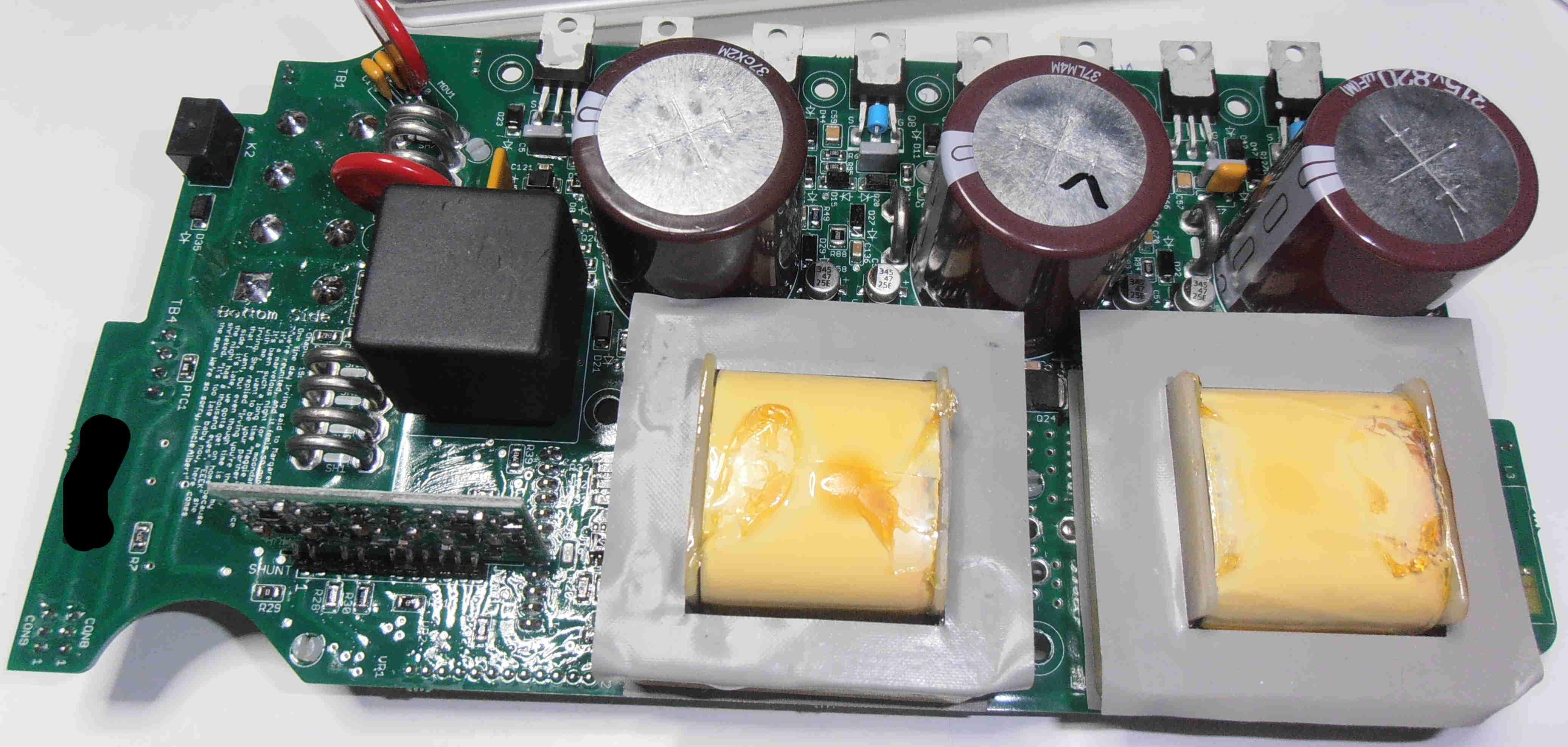 Izolační zesilovače jsou zřejmě na tom plošňáku vedle bočníků: Ta černá kostka je relé které spíná napětí od panelů.