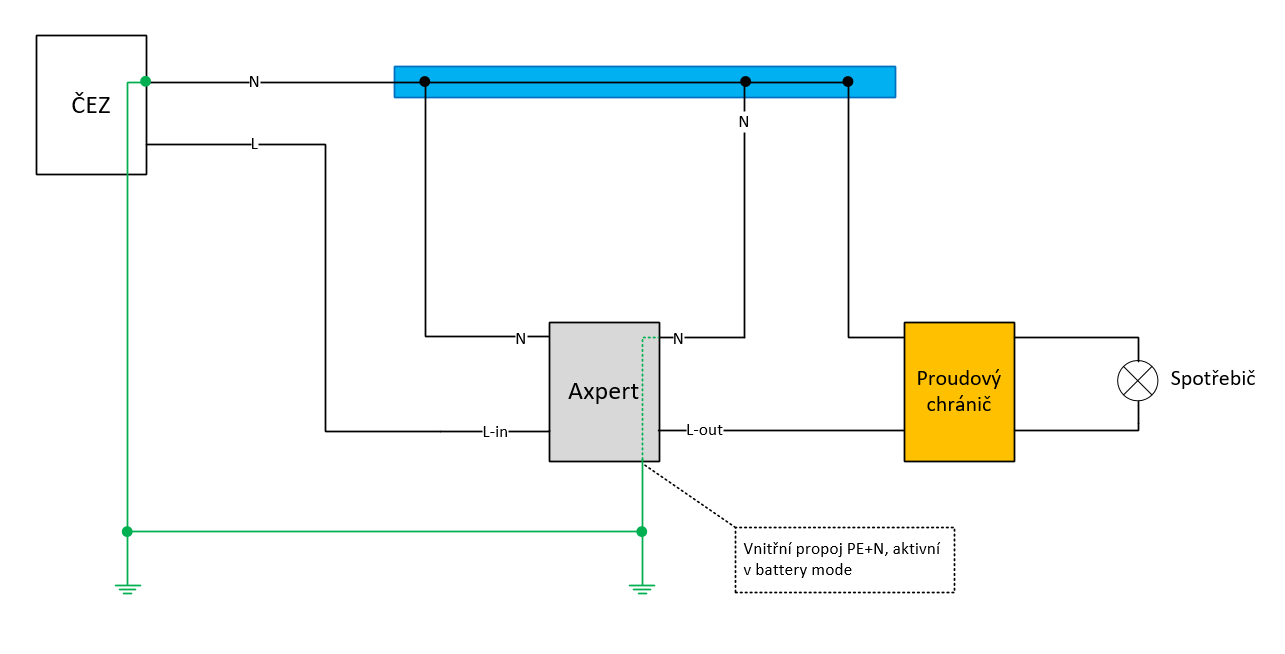Vnitřní relátko v Axpertovi, které přepíná bypass vs battery_mode, totiž nemá mezipolohu. Prostě najednou přepne L i N. Reálně se vždy jeden z těch kontaktů přepne o pár milisekund dřív, než ten druhý. Tudíž buď L nebo N během toho přepínání obchází fíčko přes "AC vstup" axperta. Pokud je ve chvíli přepínání zapnutý větší spotřebič, stačí fíčku na vybavení i těch pár milisekund.
