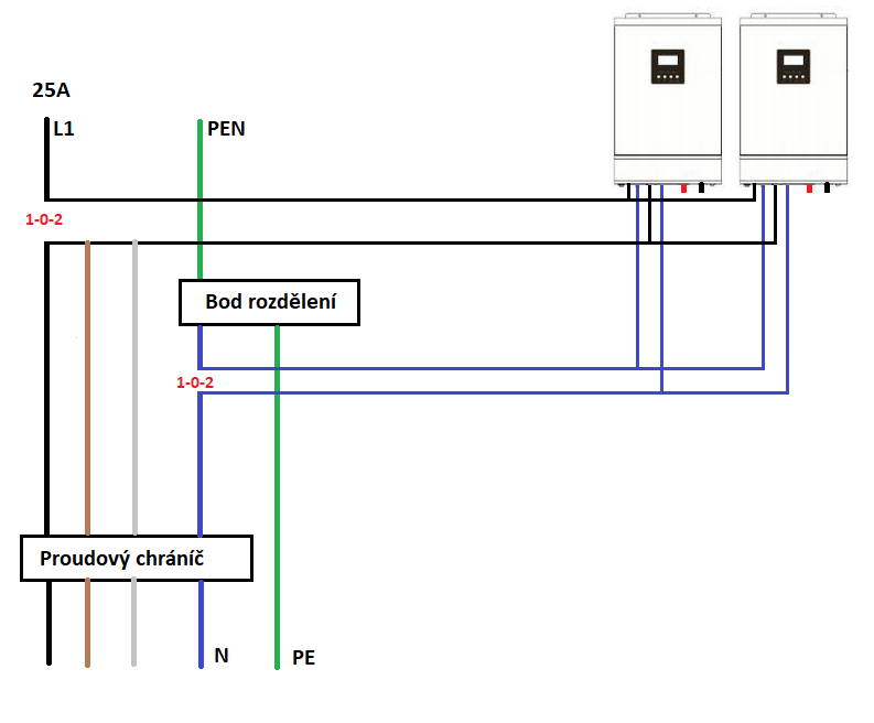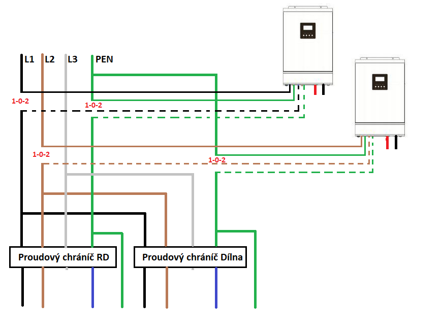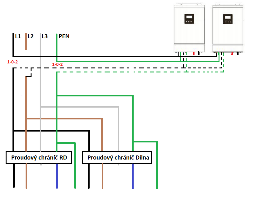 Pokusil jsem se narychlo nakreslit zapojení každý měnič svou fázy. Měly by být před FI aby fungovala proudová ochrana i na FVE. Nelíbí se mě zapojit PEN vodič přes 1-0-2. Jak by to mělo být vpořádku?marko250 píše:Všechny rozvody zůstávájí tak jak jsou,jen se odepne DS a do těch tří drátů do dílny a domu pošleš ty dva paraelní měniče,tudíš posílíš výkon na jeden drát až na výkon dvou měničů,pokud tam bude takový odběr.Samozřejmě zanikne 3f posun a vznikne jen jedna fáze.A limit celkového součtu souběhu na těch třech drátech je určen paraelními měniči.Dex88 píše:
