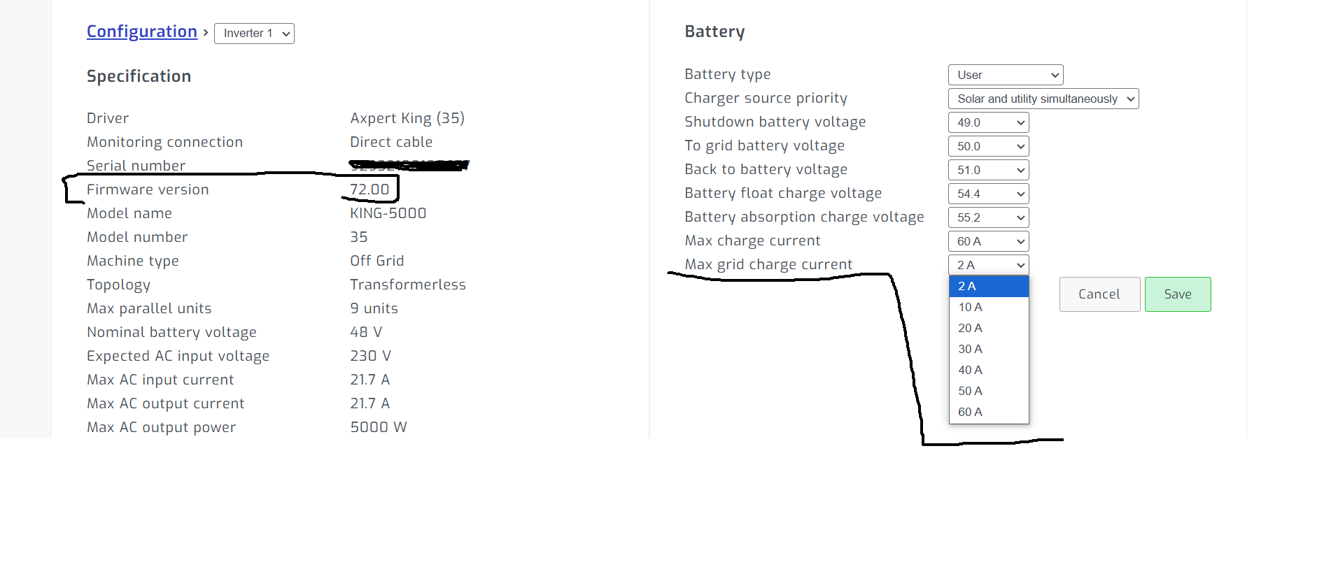 Mám otázku k tomuto staršímu střídači. Už mi jede bez problémů čtyři roky, přesto když jsem rozšířil pole tak jsem doplnil o Victron Mppt a PV od Kinga odpojil. Takže zatím mi King funguje jako měnič, jenže je potíž v tom, že v tom mám verzi 72.00 a ta neumožňuje vypnout nabíjení ze sítě. Minimální nastavení je 2A.