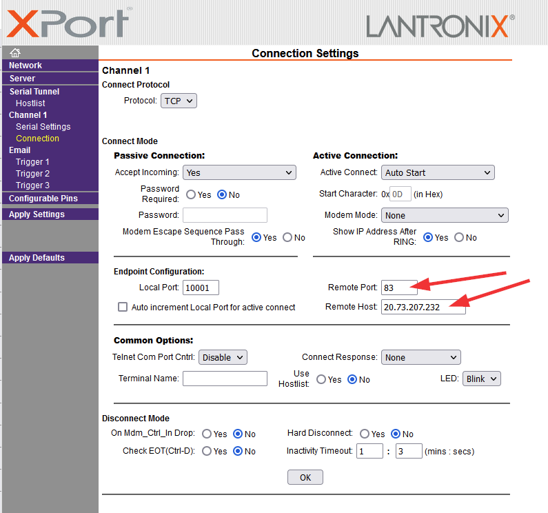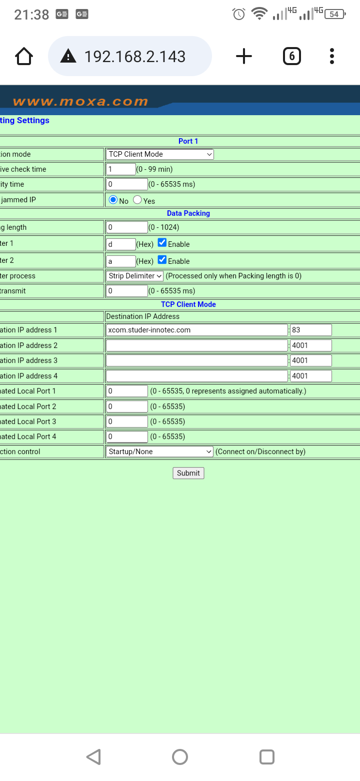 Lantronix se bohužel neumí zeptat DNS na xcom.studer-innotec.com tak jsem mu to musel zadat jako IP 20.73.207.232 Tak doufám že je Studer nebude měnít každý týden.
