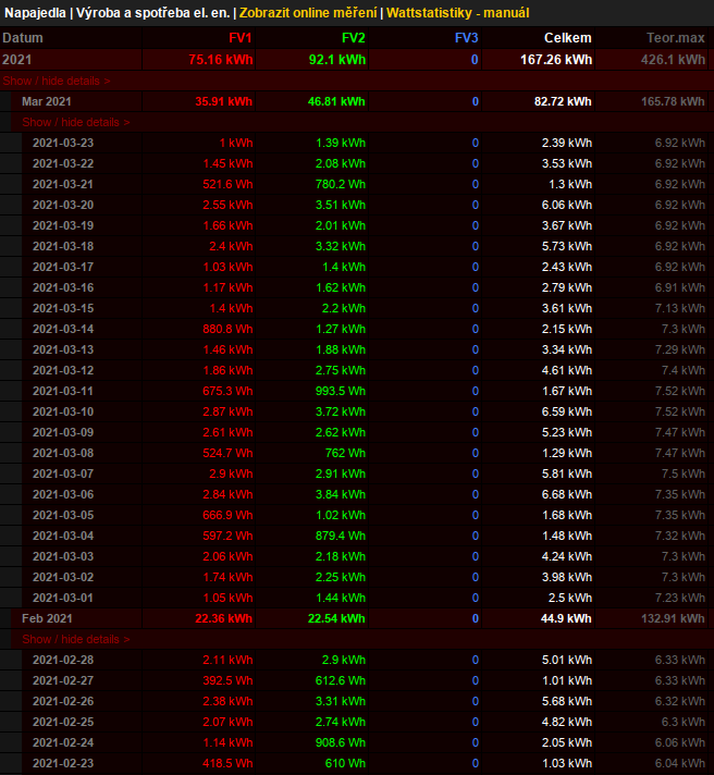Mrzí mě ty 3kWh z DS, ty mě přerušily včera ráno můj ostrovní rozjezd. Doufal jsem, že celý březen už bude čistě ostrovní. Nebýt doma ten den žena, tak to bylo v pohodě. I tak po doplnění baterií spokojenost.