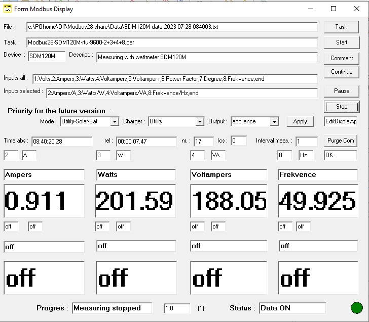 V programu Modbus28 Rtu shareware jsem omylem nepovolil v okně Display zobrazování 8 výstupů, což nebylo mým záměrem ale stalo se .. při experimentování se SUN-1000G mi tento udělal spíš potíže - když jsem mu vypnul síť v době, kdy dodával do sítě, hodilo to takovou špičku, že mi jednak shodil komunikaci s SDM120M a tím mi to zkazilo celé předchozí měření a shodilo to i internetové připojení - jak jsem o něco později ukázalo, podobnou méně destruktivní špičku je schopná hodit i úsporná žárovka 3 W v lampě při jejím zapnutí ..