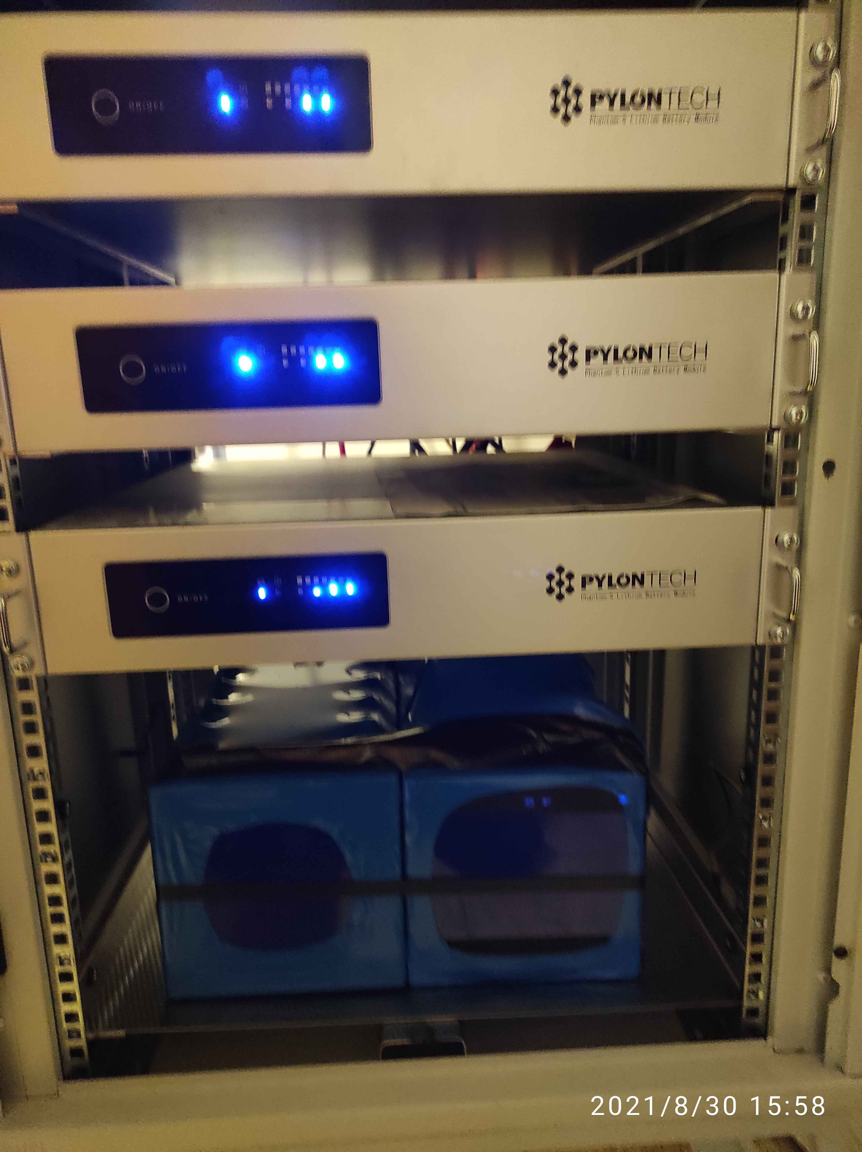 Tady je pod Pylontechy vidět přidaná baterie, která je paralelně připopjená na sběrnici k současným Pylontechům.
