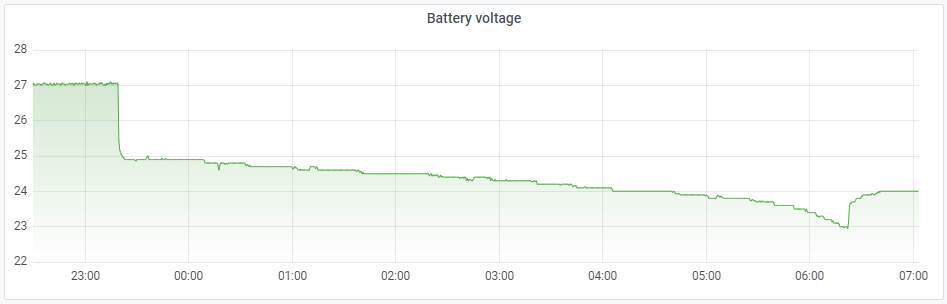 Večer jsem je chvíli podržel ve floatu a do rána nechal vybíjet cca 20 A, podle shuntu vycucnuto 142 Ah, takhle to dopadlo. Zkusím jít na 22,5 V místo 23 V, abych měl detailnější konec. Podle mojí statistiky jsem na 92% životnosti.