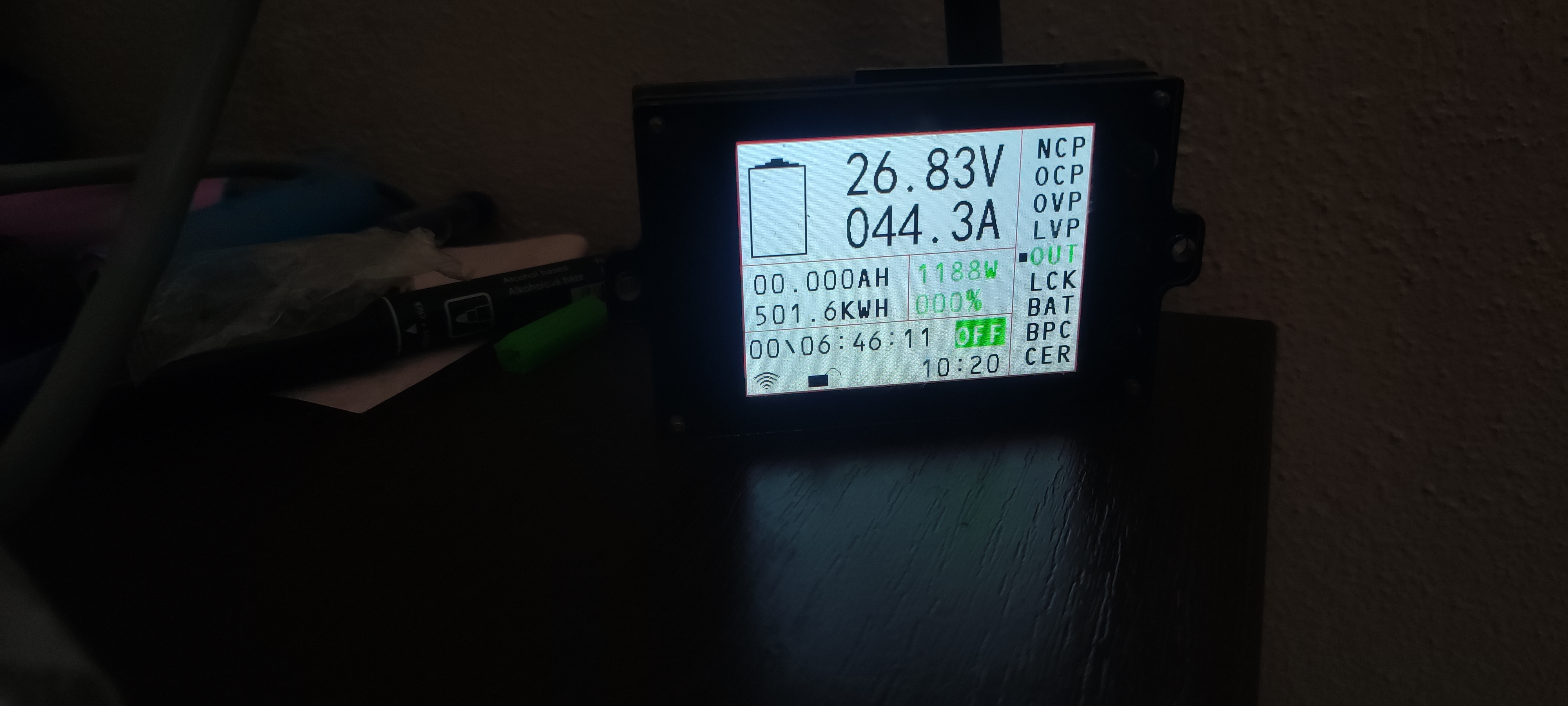 Taká zaujímavosť, keď som pripájal odpojenú 2*40Ah batériu hlavná batéria mala napätie 26,6V ale pripájaná batéria 27,7V. Rozdiel bol 1,1V , bol som zvedavý ako sa vyrovnajú. Kliešťový ampérmeter ukázal na začiatku 110A vyrovnávací prúd ktorý rýchlo klesal a po cca 5 minútach bol už len 30A kde sa klesanie takmer zastavilo a klesalo už len pomaličky.