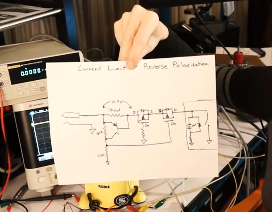 Pripojuje se baterie. Pokud se pripoji obracene poly baterie, vnitrni diody, jez jsou v MOSFETech, jsou v zavernem smeru. Vnitrni zdroj napajeni, jez je pripojen dale za CH+ a CH-, nenajede a negeneruje to +15V-B (tedy +15V napeti vuci CH- kanalu). MOSFETy nedostanou oteviraci signal na gate a nic se nedeje.