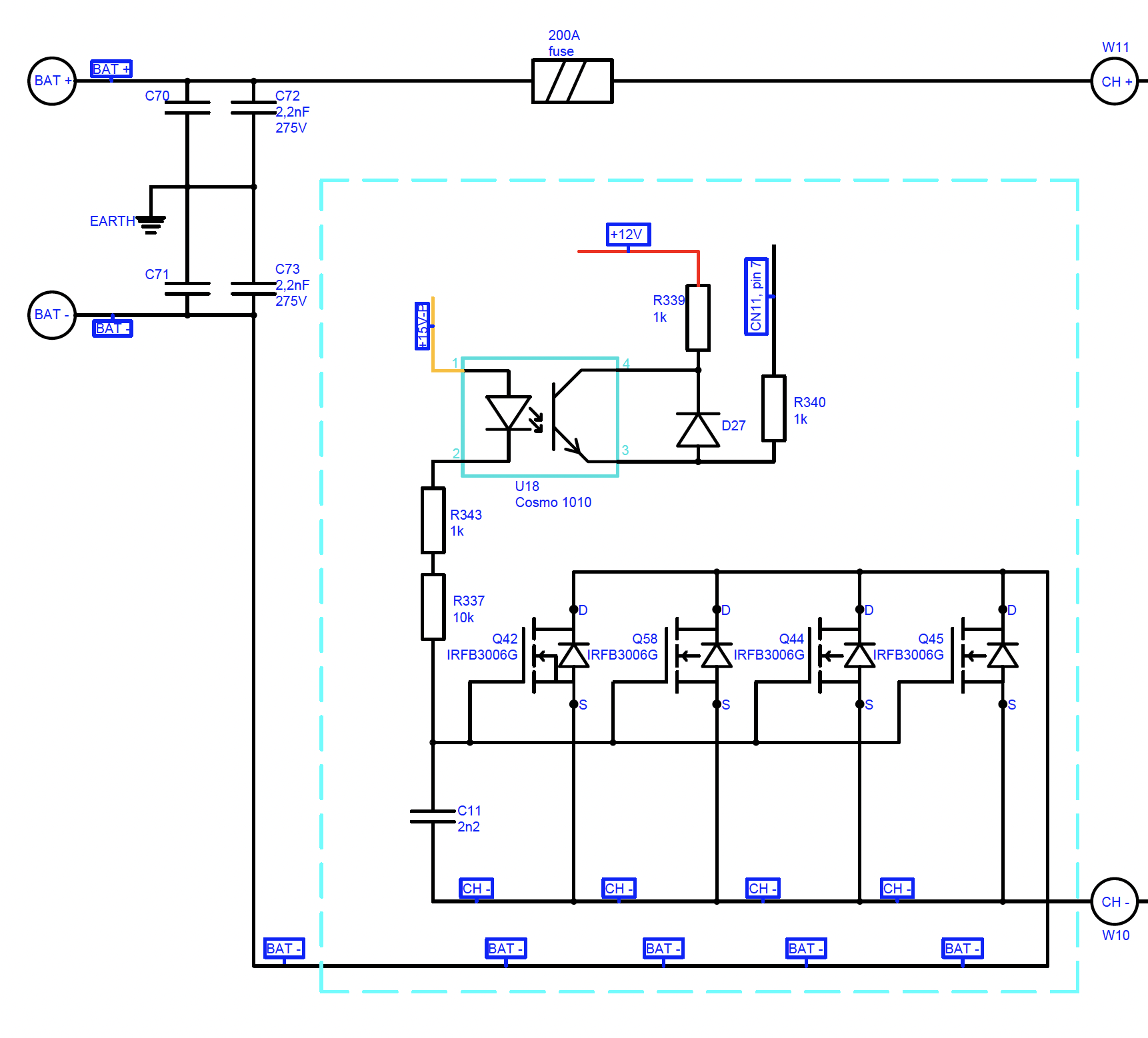 Mozna by se nejak dalo vyuzit toho jak je ve 48V invertorech udelana ochrana proti prepolovani baterie. Snese to vysoke proudy, pro vyssi napeti jen musis zmenit ty MOSFETy za verze co jsou na vyssi napeti. Ve vykonnych invertorech tam jsou MOSFETy paralelne kvuli rozkladani proudu, ale to tak je na spousty castech obvodu uvnitr. Pri tech paralelnich MOSFETech je nejlepsi davat paralelne kusy z jednen serie se stejnymi parametry, MOSFEty z ruznych serii se lisi vice a pak se mohou nektere pretezovat odpalit a kaskadove pak odpalit ty dalsi.