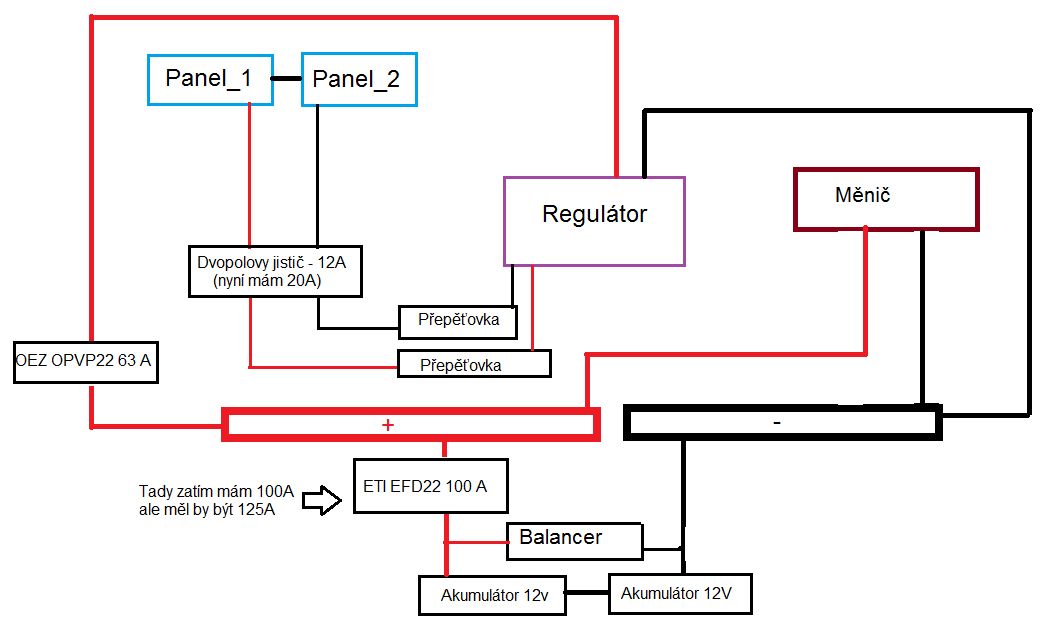 Těch 100A bych tam asi nechal, ona než se aktivuje, tak nějakou špičku zvládne. Je to spíše na odpojení baterie a při zkratu, než při přetížení. Asi bych to časem vyměnil za jistič s vyrážečem, stejně jak ho přidal k tomu od panelů, aby to šlo na dálku celé odstavit, jak jsem psal.
