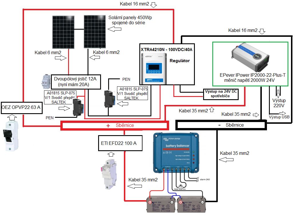 Každopádně proto ty sběrnice na plus a mínus, aby se to dalo bez problémů rozšiřovat o další regulátory, baterky a měniče.
