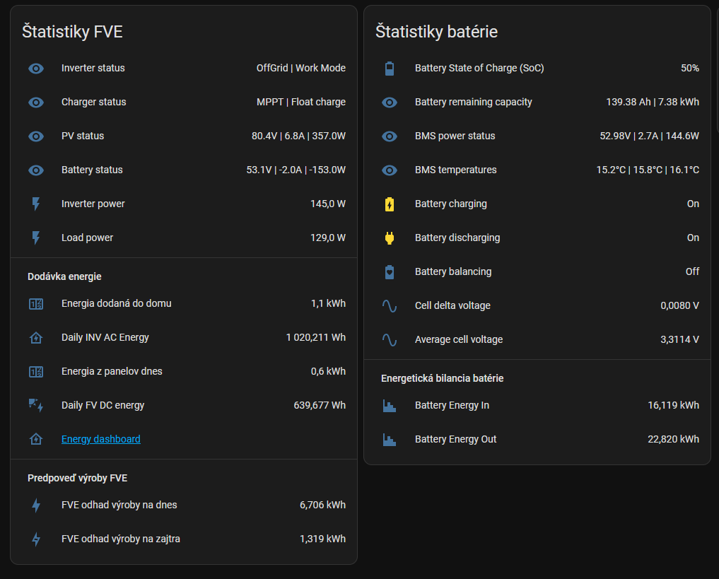 Tak JBD má tiež bujnú fantáziu čo sa týka SoC. Dnes ráno mi BMS hlásila 45% a po zapnutí kávovaru menič išiel do bypassu. Po zostabilizovaní napätia na batérii a resete kapacity (cez BT a appku) to prepočítalo na 21%. Práve riešim s developerom esphome-jbd-bms doplnenie switchu na reset kapacity... To by sa potom dalo použiť na "kalibráciu" počas bypassu, aby sa následne dalo riadiť trochu lepšie prepínanie podľa SoC.glottis píše: pon led 23, 2023 10:54 amja to mam pres victron shunt. JK BMS je bohuzel hodne nepresna a podle me je to ztrata casu a nema cenu se s tim zabyvat.