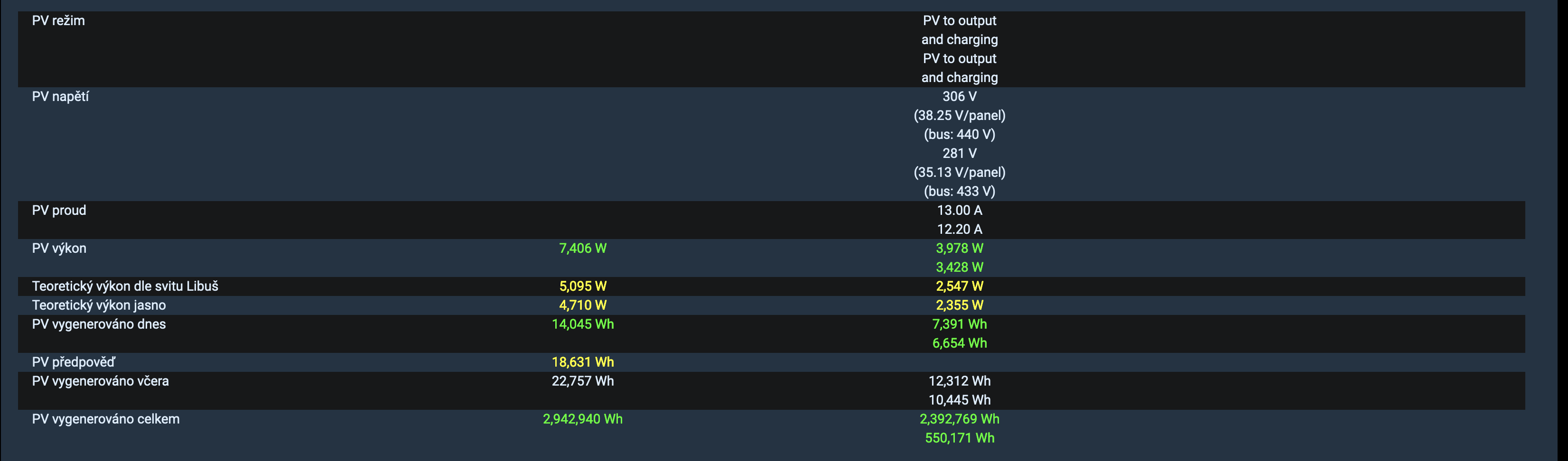 V posledni sekci mam shromazdene informace kolem PV casti. Vedle cteni aktualnich hodnot napeti, proudu, vykonu a energii na PV urovni, mam pro kontrolu integrovane ocekavane hodnoty PV dane merenim slunecniho zareni pyrometrem v nedaleke meterologicke stanici (10 minutova mereni aktualniho zareni W/m2), fyzikalniho modelu standardni atmosfery pro dany cas a polohu (neustala akatualizace atualniho zareni W/m2) a prediktivniho modelu fotovoltaickych systemu CVUT UCEEB pro danou polohu (24 hodinovy model predpovedi s hodinovymi uhrny zareni ve Wh/m2) . Na zaklade specifikace pouzitych panelu mam podle instalovane plochy panelu v jednotlivych retezcich a ucinnosti panelu 21% prepoctent slunecni zareni na predpokladany PV vykon a PV energii. Ucinnost panelu je dodana pro standardni podminky a osvit z predni strany. Po te co jsem panely umistil na pergolu do vysky, pobiraji i odrazy ze zadni strany, lepe se chladi a nemam problem zatim prekonavat prepokladane hodnoty na zaklade slunecniho zareni. Pod panely mam svetlou dlazbu a na dome svetlou fasadu, pokud panely nedavaji prilis velky proud jako napriklad nyni tak generuji vice nez je teoretika hodnota. Nyni napriklad 40% nad teoretickou hodnotou. Pri vyssich proudech panelem (a aktualnim vykonu panelu nad jeho papirovymi 535 Wp) uz pak nevykazuje takto vysoke navysovani oproti predpokladu.