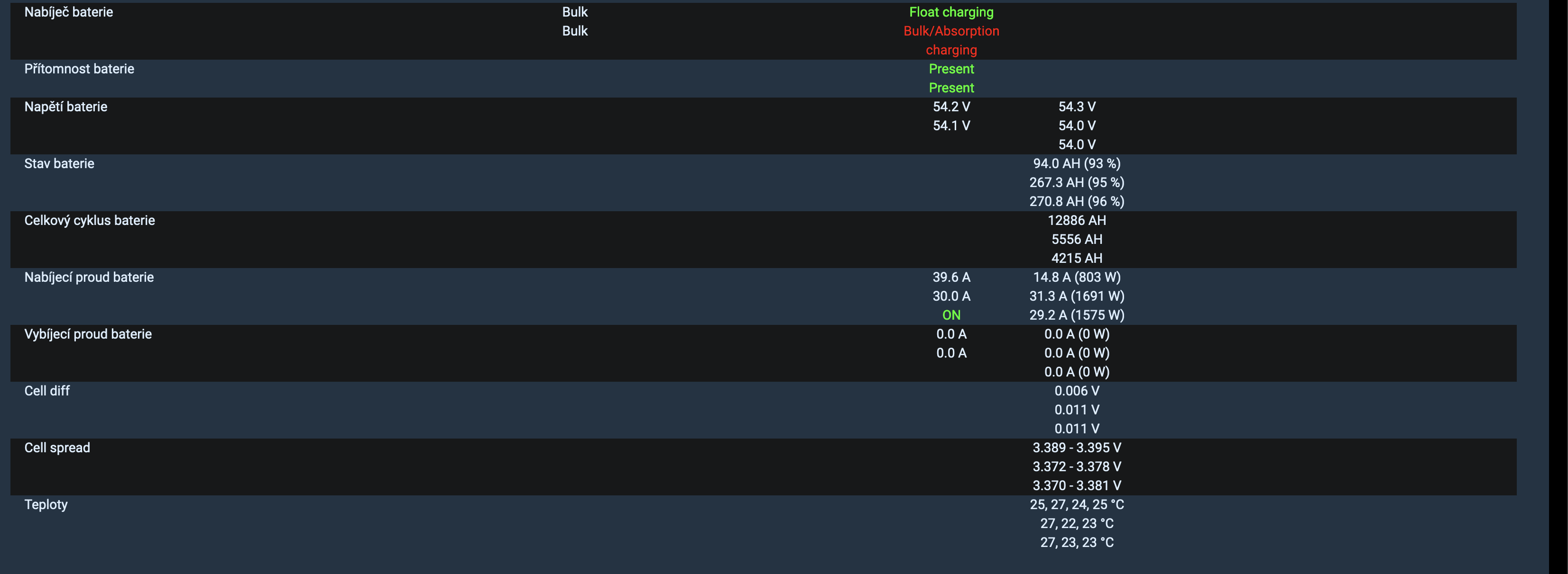 V teto casti jsou informace kolem baterie z pohledu invertoru a BMS. Male rozdily v napeti a proudu v jednotlivych zarizenich jsou dane tim ze se jedna o nezavisla mereni v case. V AntBMS na prvni baterii nejde kalibrovat mereni napeti, takze z toho duvou ukazuje na celkovem napeti o 0.1-0.2V vice a na jednotlivych clancich baterie o cca 10-20 mV vice. Jinak jsou mereni proudu a take napeti v ostatnich BMS kalibrovany. Mereni v invertoru - napeti, proudy na baterii, PV, AC i BUS jsou take kalibrovany. V invertorech spojenych parallelne, mi funguje spatne vnitrni prepinani bulk a float dobijeni. Nahodne jeden nebo druhy invertor prejde predcasne do float rezimu aniz by baterie vubec dosahla pozadovaneho napeti pro bulk nabijeni. Rezim bulk nebo float tedy ridim externe prostrednictvim dynamicke zmeny dobijecich parametru (napeti, proud) v invertoru. Zohlednuji potrebu balancovani jednotlivych clanku v kterekoliv baterii, teploty clanku/BMS a v pripade velkeho rozbalancovani baterii zpomaluji dobijeni misto ponechani rychleho zvedani napeti jednoho z clanku jez pak vyusti k reakci BMS a uplneho odpojeni dobijeni konkretni baterie.