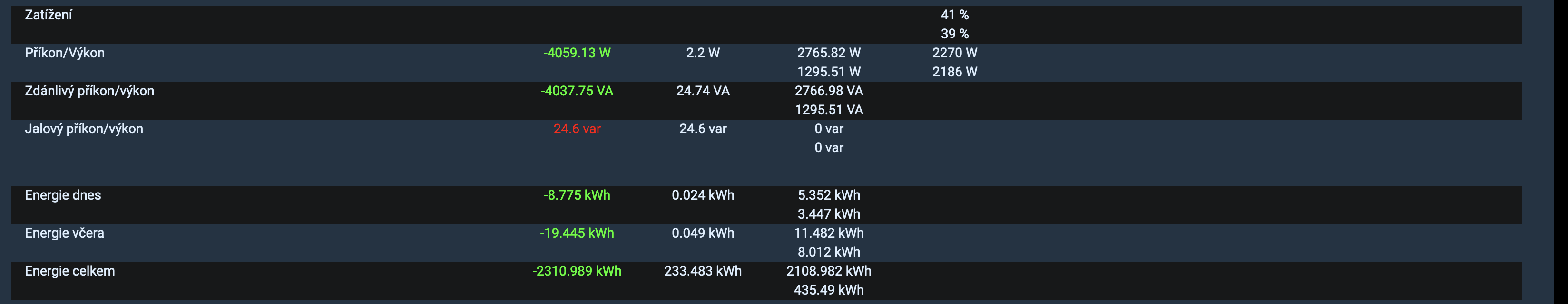 Takže kdybych invertory úplně vypnul, ušetřím těch 0.96 kWh za den. Při výpadku elektřiny vypadnou i další počítače co doma provozujeme. Takže ty bych musel chránit vlastními UPS, které by v potřebném počtu stejně měly příkon v provozu těch 40 W. Tak mě těch 0.96 kWh za 24 hodin zálohování nevadí. Za celý měsíc je FVE stejně i v nějhorším měsíci v plusu co se týče AC činné energetické bilance. Pokud to v mém předchozím příspěvku vyznělo tak, že jsem překvapený nebo si stěžuji, tak to jsem nechtěl. Pouze jsem pro úplnost dat co měřím a zveřejňuji zmínil co to znamená, když jsou denní souhrny záporné.