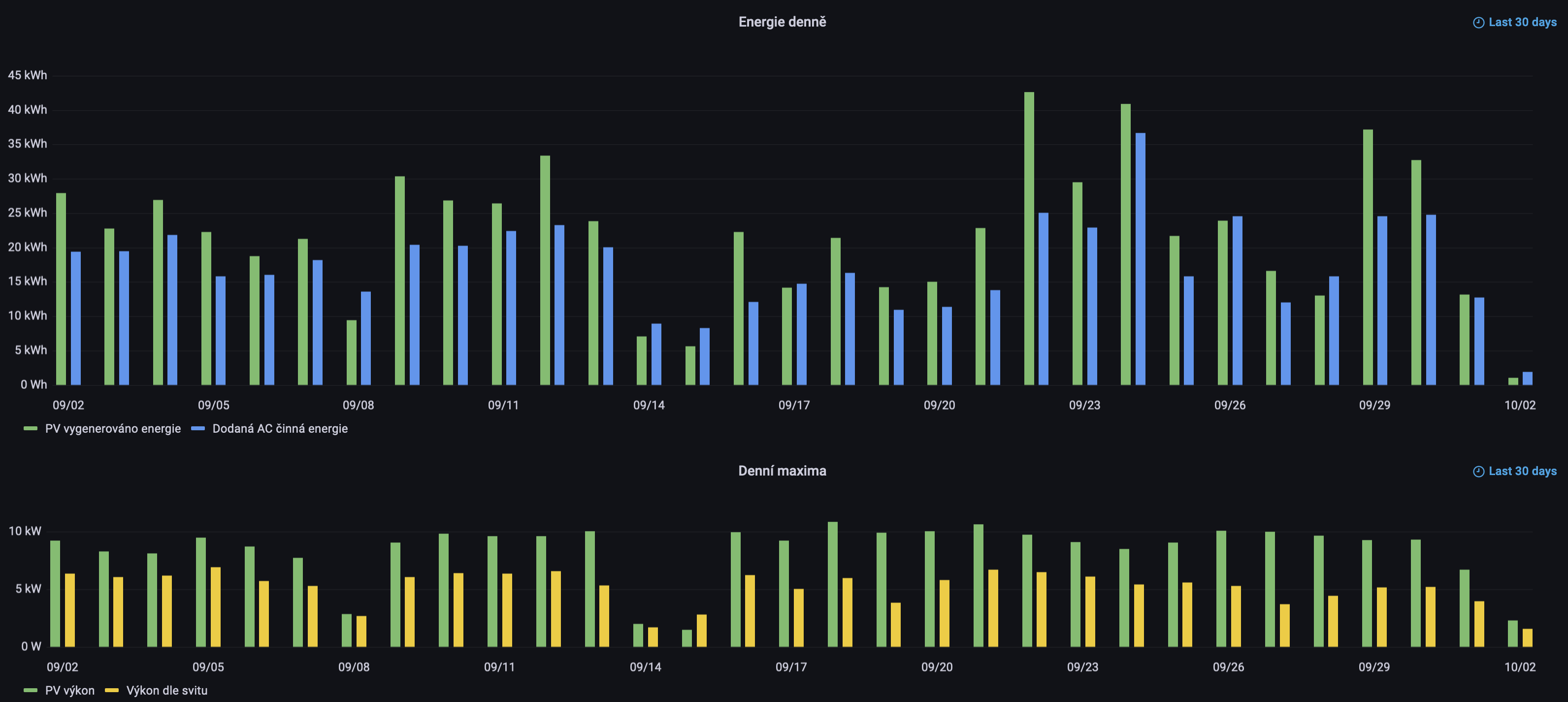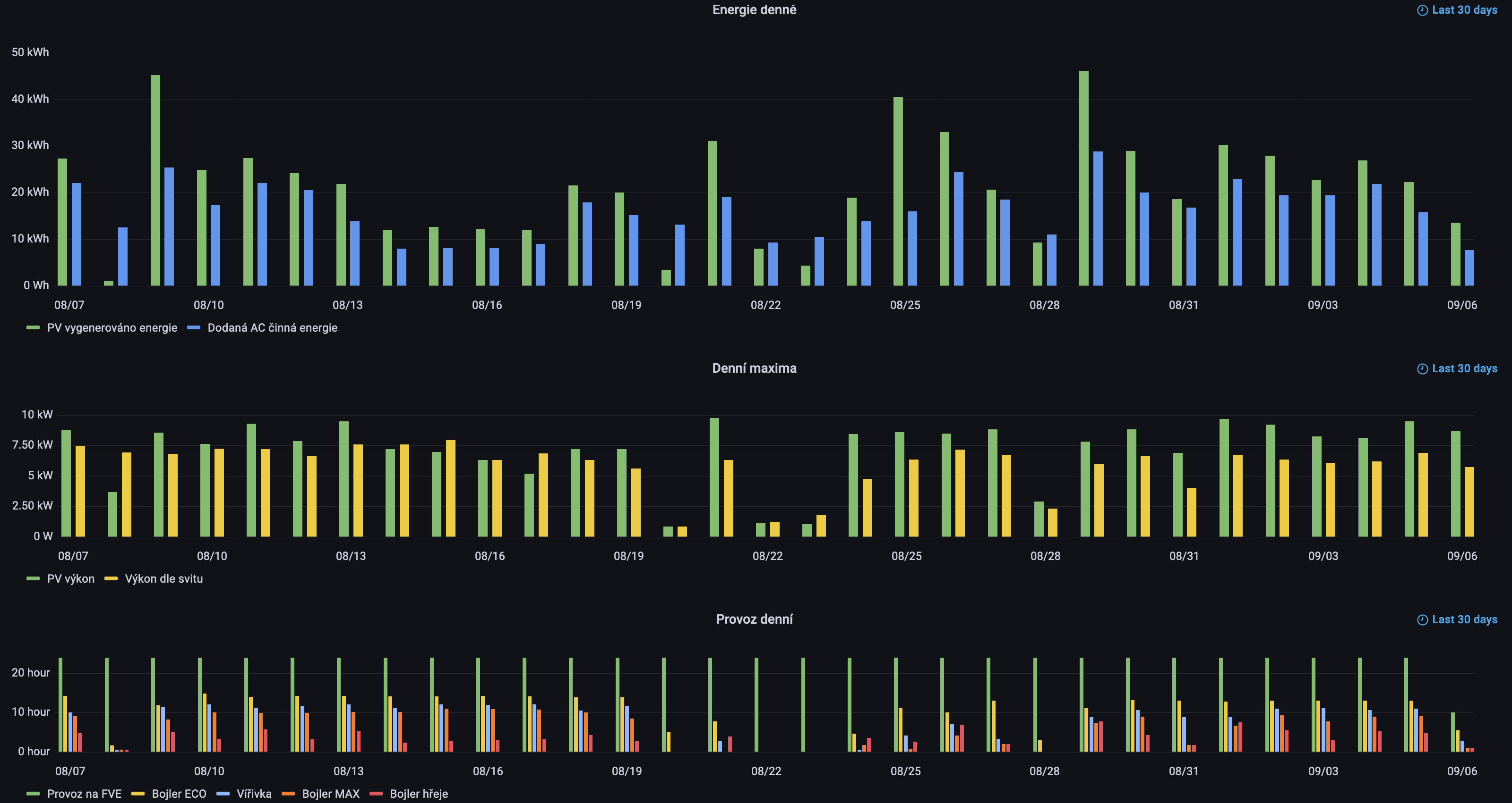 Prvni a posledni graf ma stejny vyznam, jen se jedna o data v kalendarnich mesicich. Prostredni graf maxim na mesicni urovni nedaval smysl tak jej nesleduji. System sberu dat jsem na FVE zacal provozovat teprve v prubehu letosniho ledna. V teto dobe jsem mel v provozu pouze jeden string mensiho mnozstvi panelu polozenych na zahrade na zemi, nevhodne orientovanych a casto zastinenych. Navyseni mnozstvi panelu na soucasny stav a jejich umisteni na pergolu probehlo v prvni pulce cervence. V cervenci bylo vyrobeno a spotrebovano 665 kWh PV energie a v srpnu 650 kWh. Data za zari teprve nabihaji, takze se uvidi za mesic jak zacne vyroba pripadne klesat.
