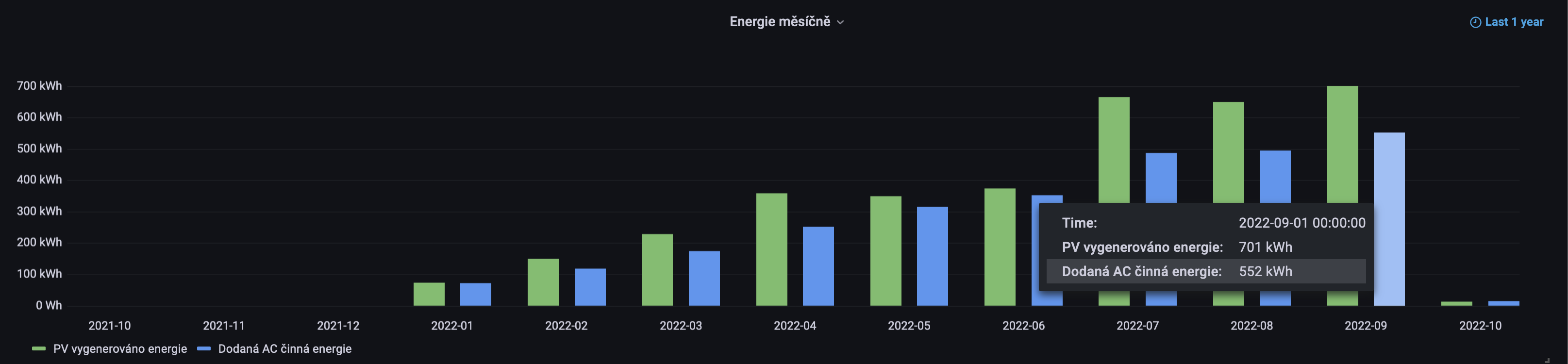 V měsící září 2022 mi ostrovní FVE vygenerovala 701 kWh na PV straně a to odpovídá činné lokálně spotřebované AC energii 552 kWh (energii spotřebovanou/ztracenou veškerou elektronikou FVE nepočitám do spotřebované a tudíž neodebrané činné AC energie z distribuční soustavy). Celkově jsou čísla o trochu více než v předchozím měsící, i když má tento měsíc o jeden den méně. V září jsem neměl žádnou dovolenou, jež by se projevila menší poptávkou po energii.